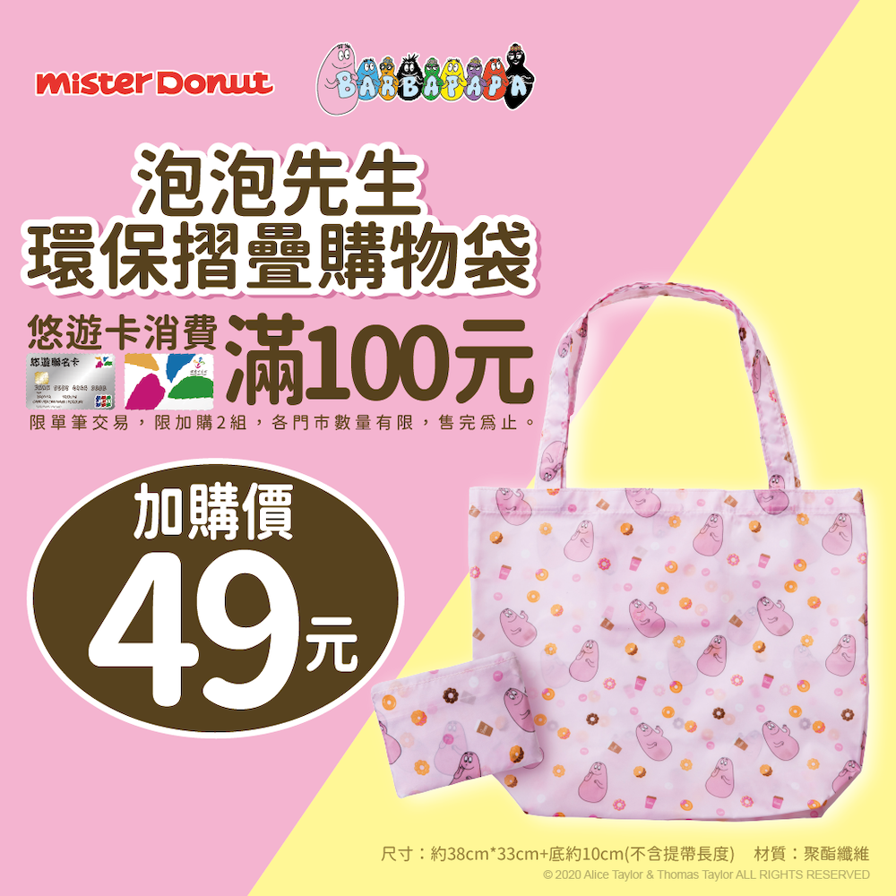 ▼同時,Mister Donut 也與泡泡先生合作推出第二波限定商品。粉嫩、Q萌的泡泡先生,任何時候都面帶溫暖的微笑,有著軟綿如棉花糖般的身軀、能隨心所欲的變身為各種形狀,這次泡泡先生變成購物袋啦!