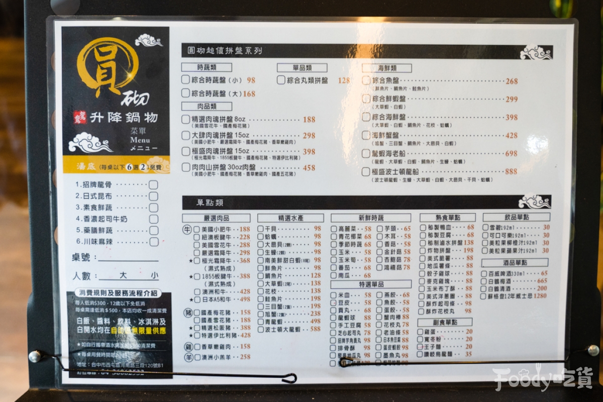 ▼餐點的部份是以單點為主,火鍋最重要的角色就是湯底啦,「圓砌鴛鴦升降鍋物」湯底共有六種選擇,每桌可以選擇兩個湯底,重點是湯底「不用錢」,在外面吃火鍋一份鍋底可能就要兩三百元,在這裡用餐直接省起來!