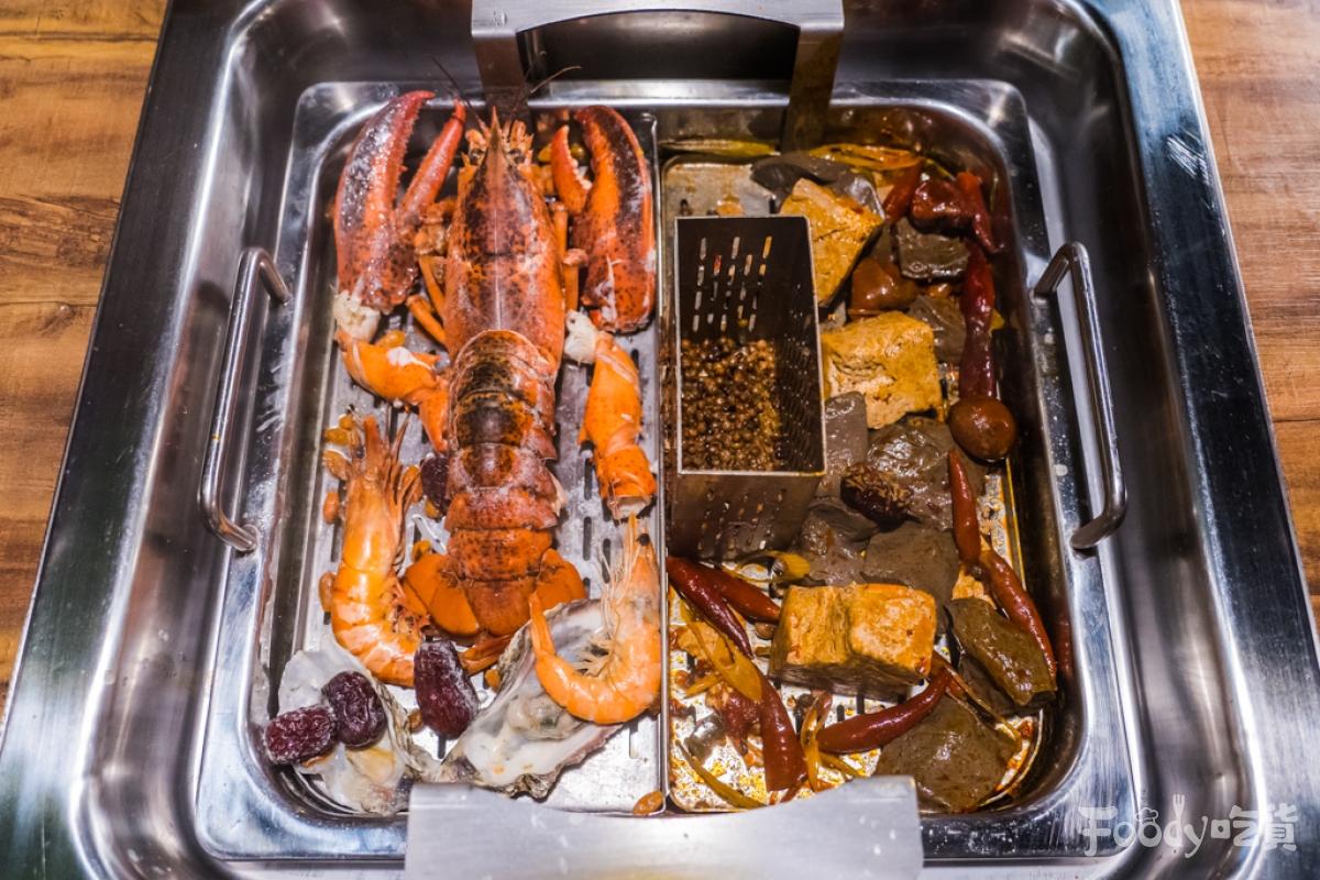 ▼建議把海鮮放在湯頭較清淡的鍋底熬煮,龍蝦只需要熬煮約十分鐘即可起鍋,其他海鮮也可以依照個人喜好來熬煮~海鮮新不新鮮在剝殼的時候就能發現,而「圓砌鴛鴦升降鍋物」的海鮮每一個都非常新鮮美味,龍蝦在剝殼時可以將整塊龍蝦肉剝離,鮮甜Q彈的龍蝦肉,吃一口喜悅感瞬間湧上心頭~還有大生蠔、白蝦、干貝也很清甜,完全不需要沾醬料也能吃到「尚青」的海味!