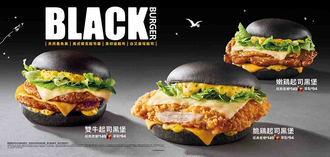 「嫩鷄起司黑堡」:2020年5月6日起至2020年6月9日止限期供應或售完為止,單點94元、經典套餐149元