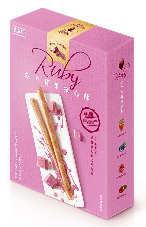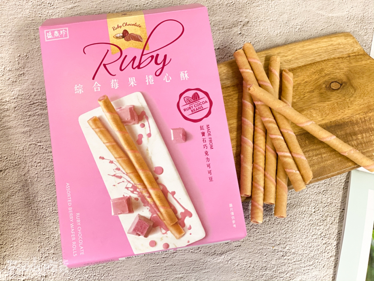 ▼「Ruby綜合莓果捲心酥 $79」使用Ruby巧克力,呈現淡淡的莓果香氣,綜合莓果風味-覆盆莓、藍莓、草莓、蔓越莓,酸酸甜甜的口感真的太欠吃~