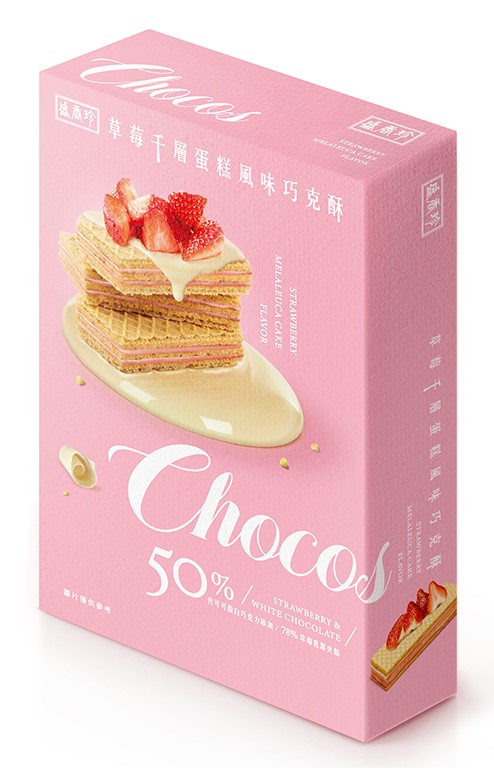 ▼「草莓千層蛋糕風味巧克酥 $79」代可可脂白巧克力含量高達50%,使用奧地利草莓粉,夾餡率高達78%,草莓千層蛋糕風味非常濃郁~