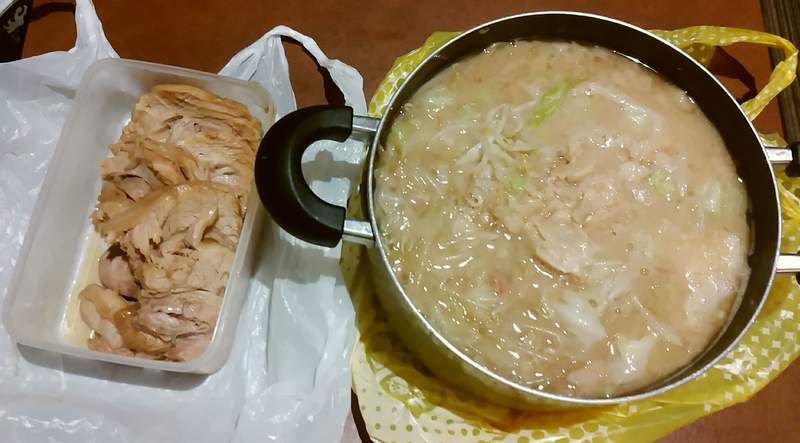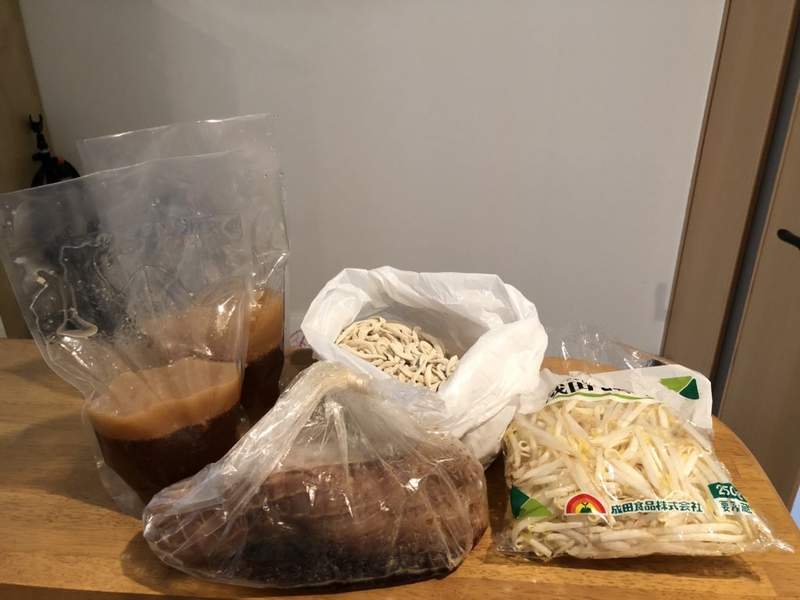 ▼從這位推主po出的照片可以看到,他從「拉麵二郎」外帶回來的拉麵份量超足,特別是裡面的叉燒,好大一整塊!店員直接給的是生麵、生豆芽菜、湯頭等食材,想吃的時候可以自己煮。