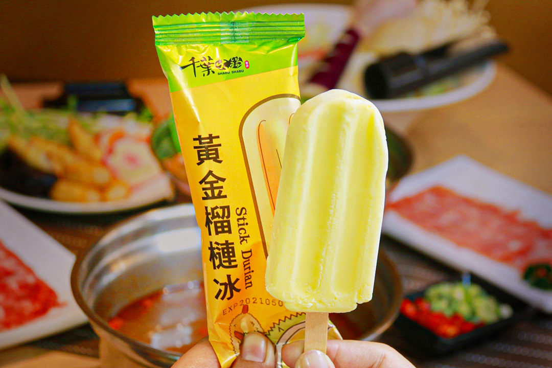 ▼值得一提的是,這款「榴槤冰」取自最新製冰技術加上新鮮的榴槤水果,冰棒口感Q彈有咬勁,連大人、小孩都喜歡,保證吃過一次就念念不忘~目前在千葉火鍋店已經能吃到這款「黃金榴槤冰」啦,不過因每家分店的配貨量不同,晚來可能會吃不到喔~
