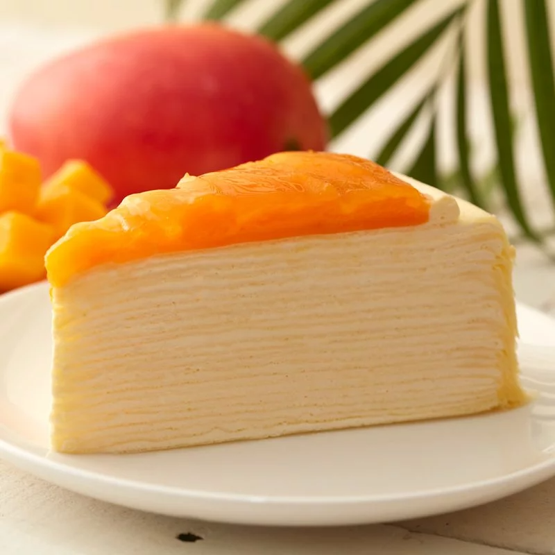 ▼芒果千層中間則有著多達20層以上的蛋皮,讓品嚐起來的口感更細緻。中間則以芒果卡士達作為夾層,吃起來酸甜不膩口,非常對味。