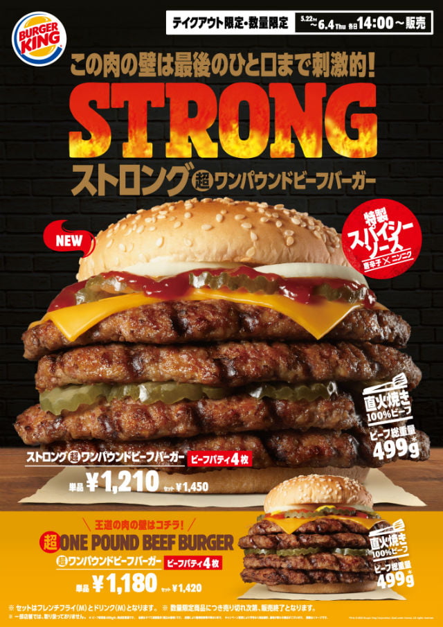 「Strong Super One Pound Beef Burger」漢堡是期間限定商品,只在5月22日到6月4日限期供應。漢堡的價格為1210日圓(約台幣338元)、套餐的價格為1450日圓(約台幣405元)。這段時間在日本的話可以去漢堡王吃這款漢堡,試試自己的胃口!