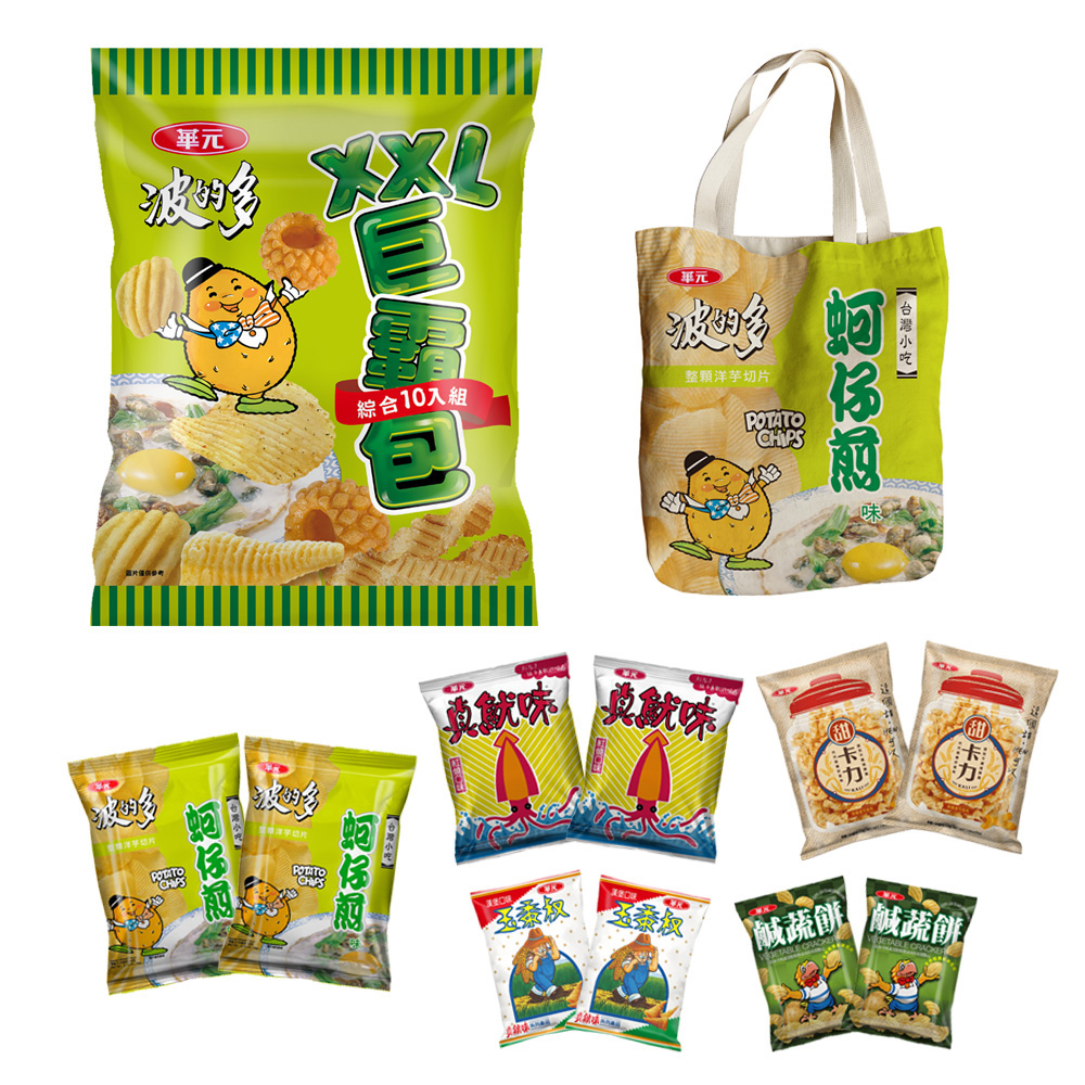 內容物:蚵仔煎洋芋片/鹹蔬餅/玉黍叔/真魷味/甜卡力+蚵仔煎帆布袋