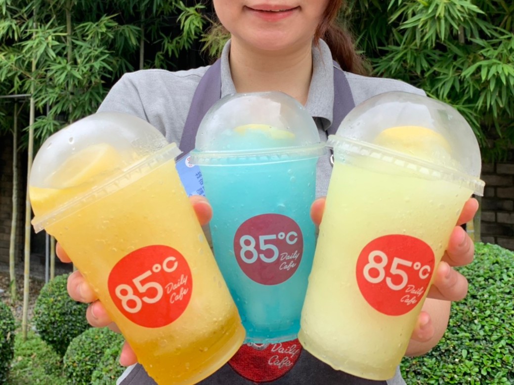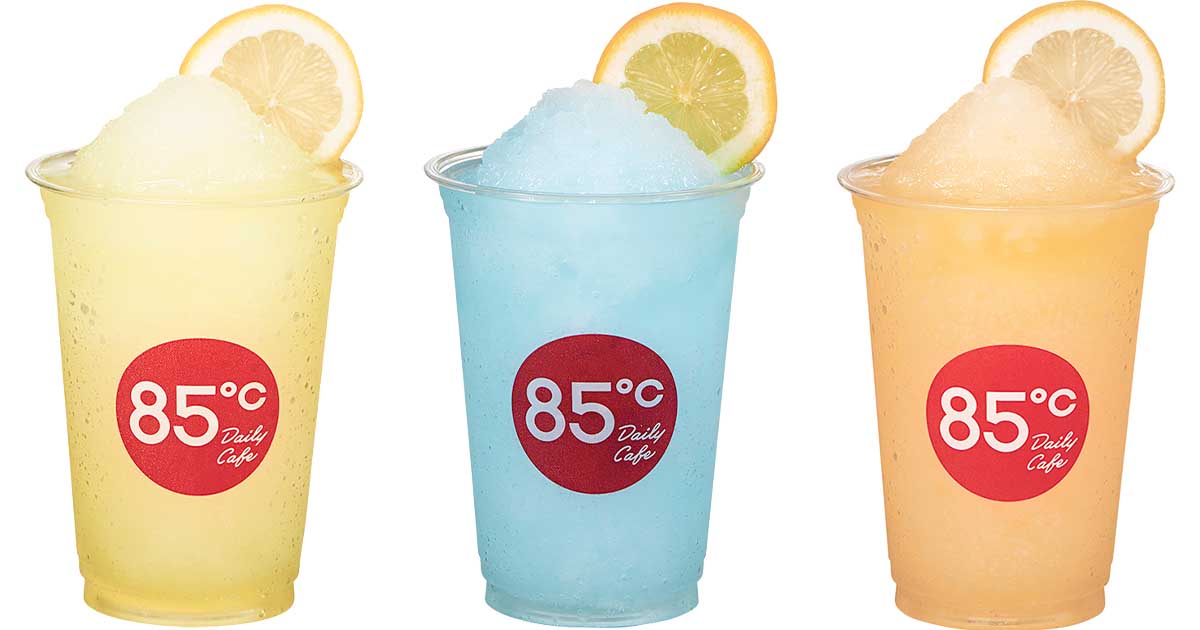 ▼(左起)酸甜檸檬、經典蘇打、清新乳酸3種口味,加上一片新鮮黃檸檬增添人氣,每一口都酸甜清爽,視覺、味覺上都超沁涼!這3款冰沙即日起在全台85℃門市上市,經典滋味必嚐鮮!