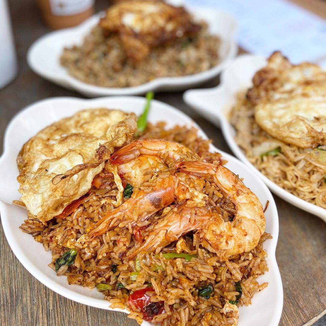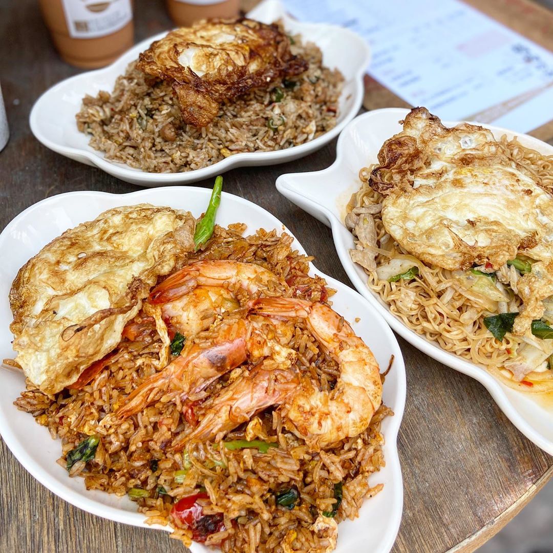 ▼另一道人氣料理是「泰式大蝦蛋炒飯」,三隻大蝦直接撲在熱騰騰的炒飯上,泰式酸辣醬炒出來的飯吃起來甜甜辣辣的,配上這新鮮的大蝦實在是太滿足!還可以加點「蓬裙蛋」,荷包蛋外層被煎的金黃酥脆,讓蛋黃流進炒飯裡,老饕就是要這樣吃啊!