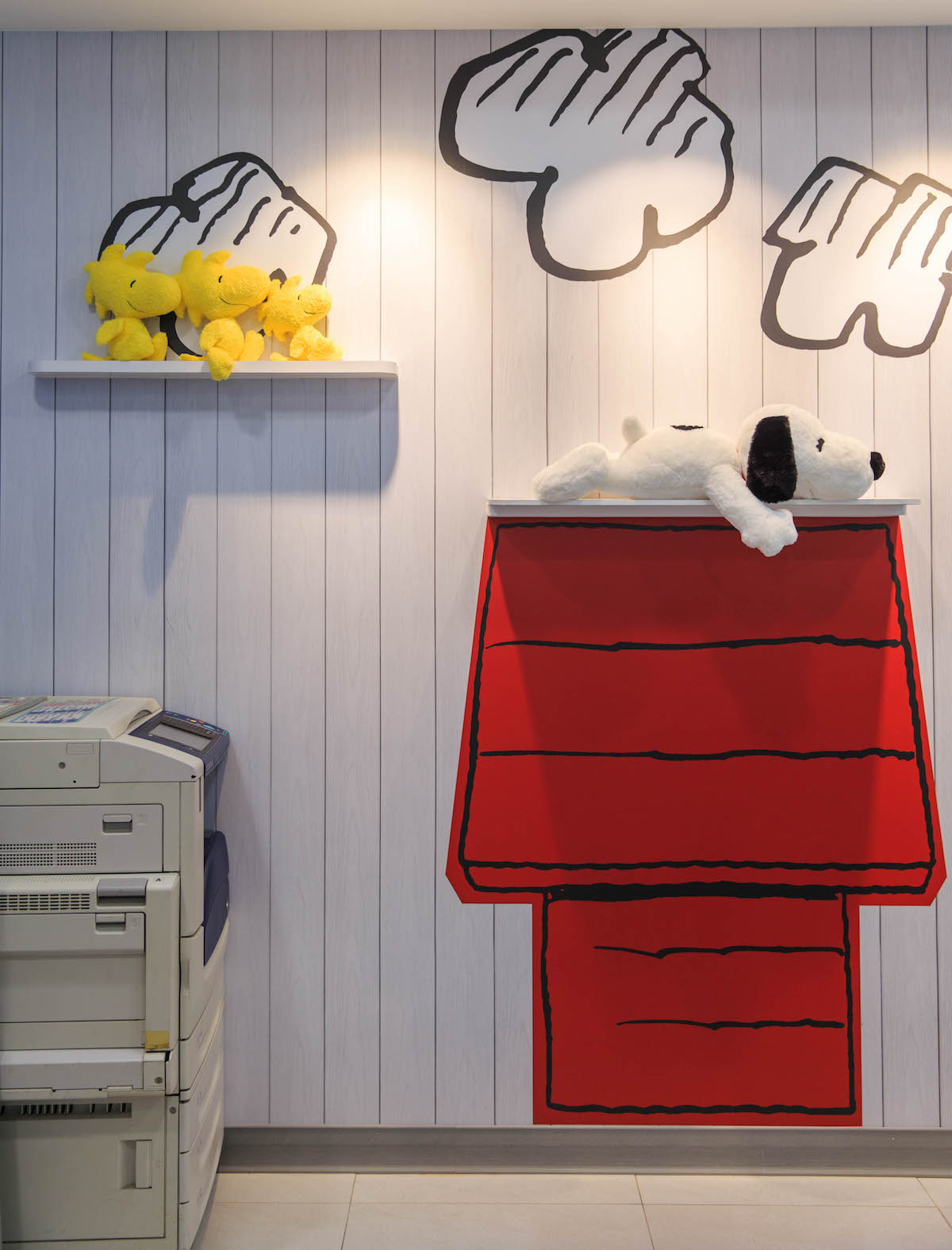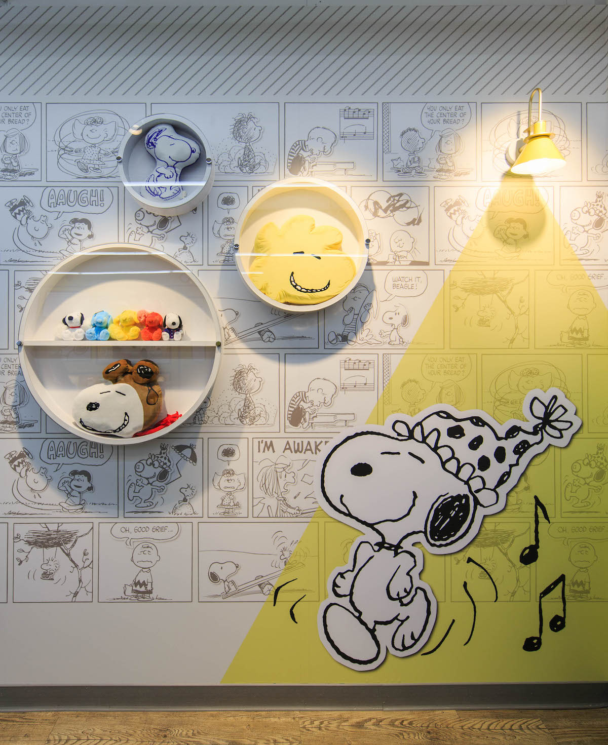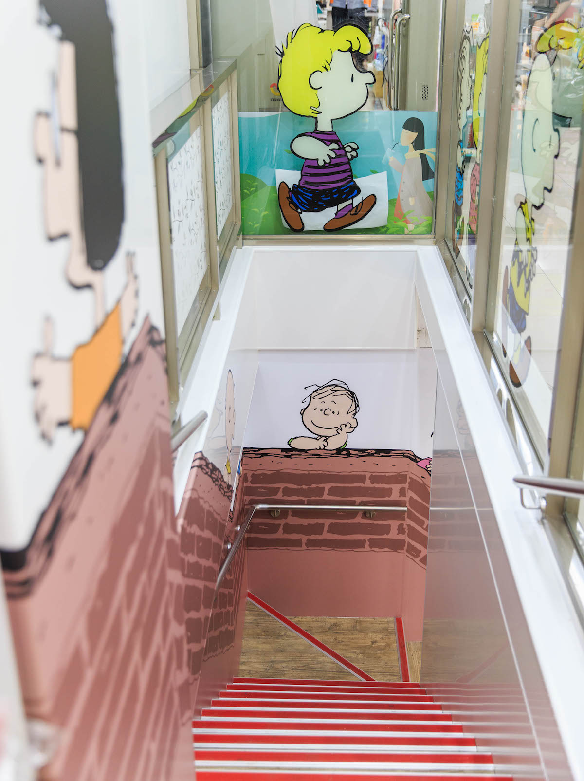 ▼子店在入口處則設計高2.7公尺長約6公尺的超大型牆面,將史努比、胡士托、查理·布朗等經典人物置入其中,樓梯間更使用大面積壁貼,將史努比與好朋友們在圍牆邊聊天玩耍的設計融入一樓賣場及B1休憩區,賣場的玻璃隔板還有史努比與好友們的奔跑畫面,讓人不禁停下腳步來細細品味,絕對是粉絲必拍的熱點。