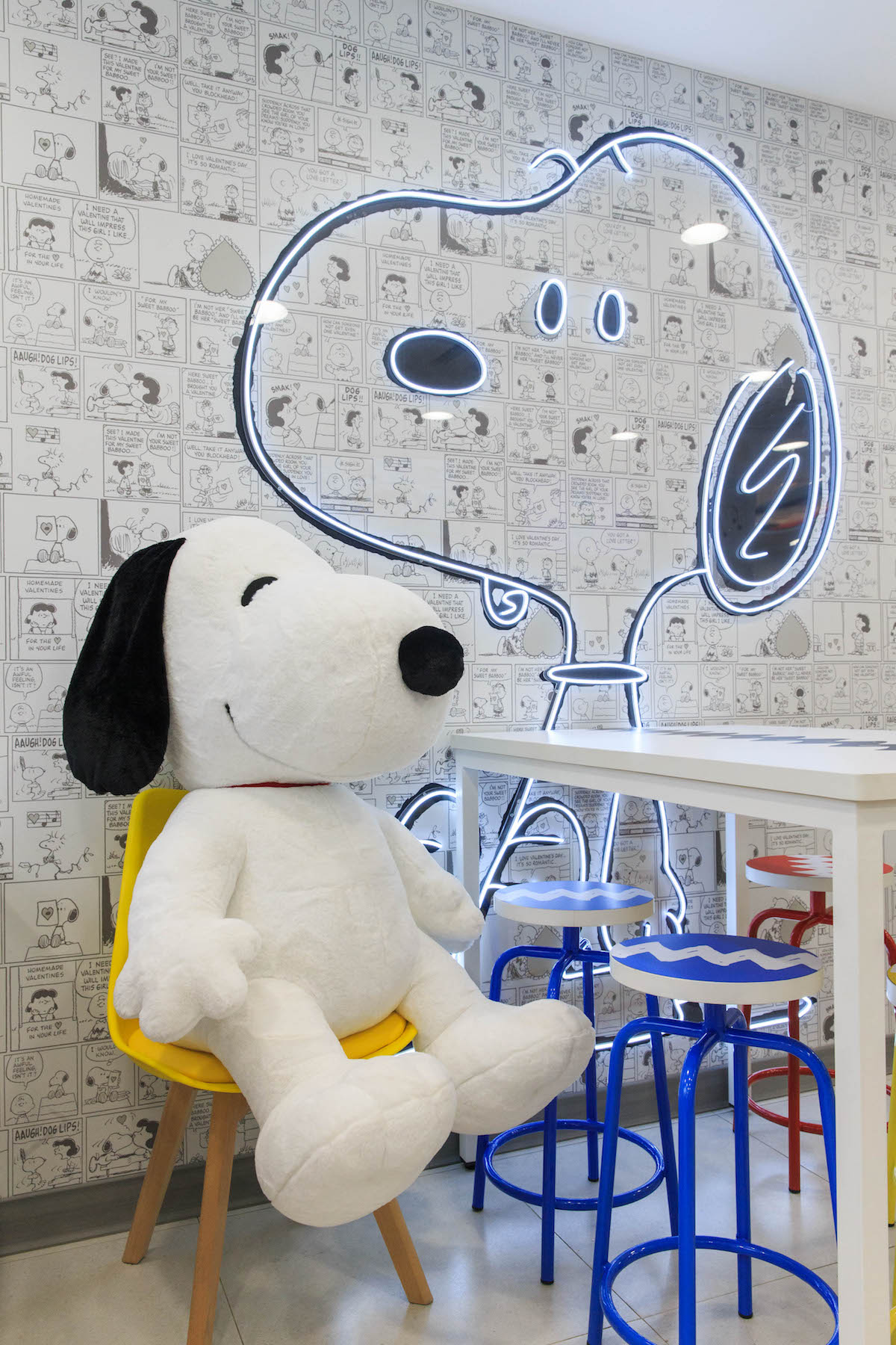 ▼這次聯名店首次採取「雙門市設計」,總面積68坪完整呈現漫畫場景;店鋪設計從櫃檯延伸到天花板、牆面、桌椅等都是史努比(SNOOPY)與他好朋友的蹤跡,彷彿帶你走入時光隧道,俏皮呈現花生漫畫《PEANUTS》的日常互動,歡迎大家到史努比聯名店走走。