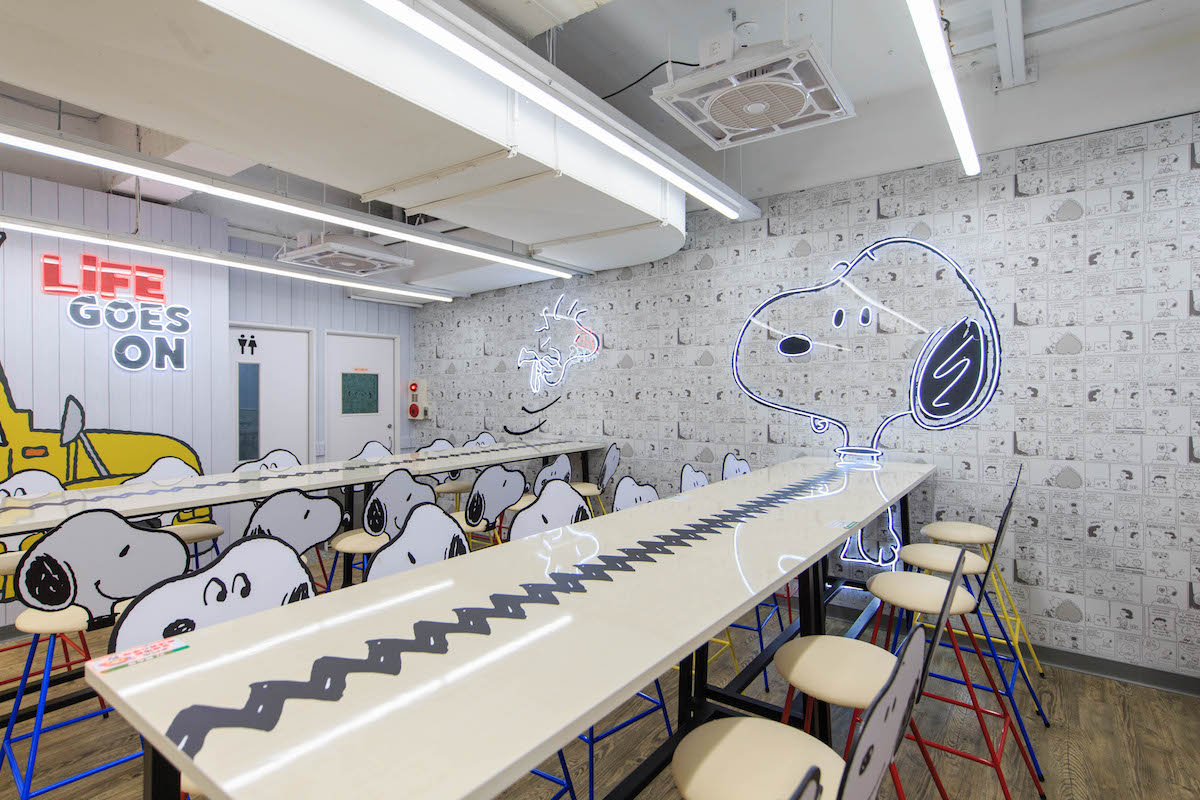 ▼休憩用餐區牆面有史努比與胡士托造型的大型繽紛霓虹燈,並搭配不同表情以及紅、黃、藍色的造型鐵椅,完美呈現美式復古工業風。