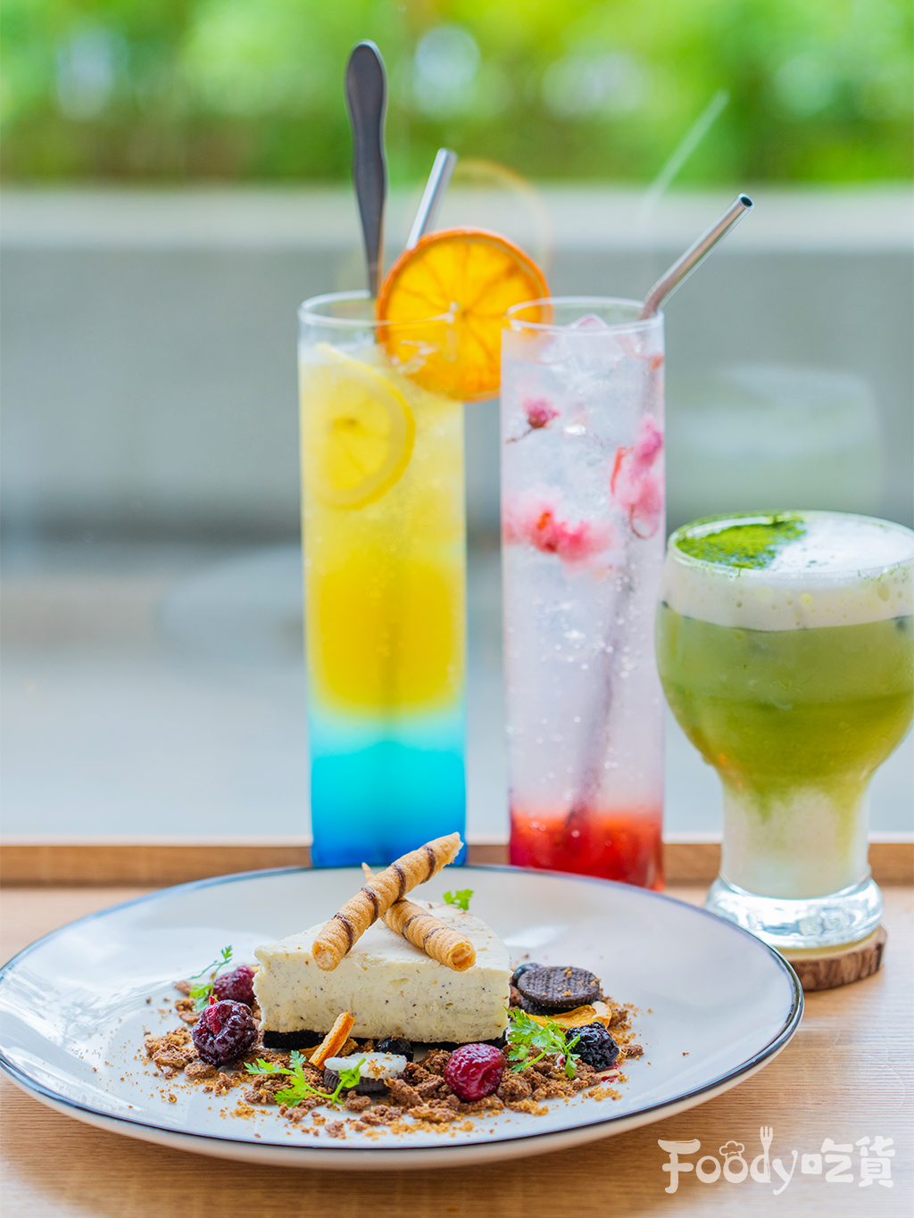 ▼吃完正餐,下午當然要來份甜點配飲料,OREO乳酪蛋糕吃起來厚實濕潤,帶有乳酪微鹹微酸的迷人風味,與OREO餅乾碎的可可香,再用酸香小紅莓點綴,不但擺盤美美的,也讓人一口接一口~搭配漸層色氣泡飲,或是香甜的抹茶牛奶,吃完這份午茶絕對心花開!