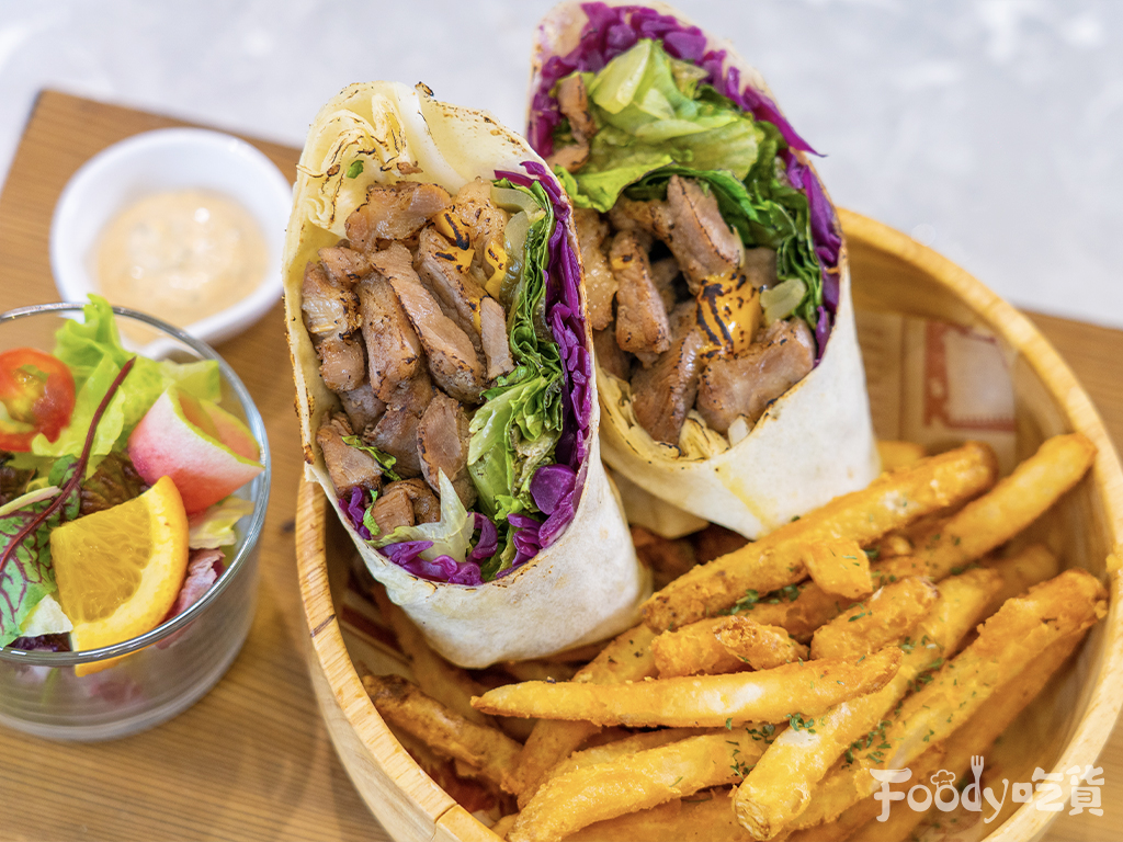 ▼「墨西哥捲餅」餅皮薄而紮實,搭配古早味醃漬梅花豬,鮮嫩豬肉的肉香與捲餅麵香,以及特製醃菜的酸香口感,吃出多層次滋味與口感。