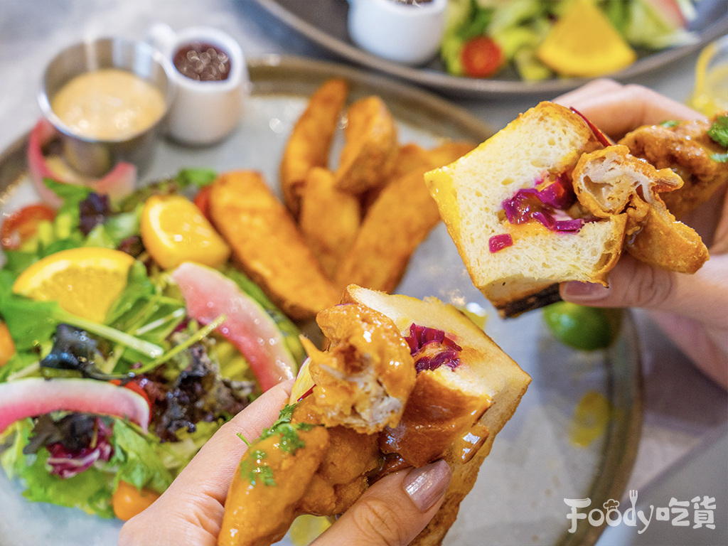▼「英格蘭堡」選用特製的牛奶麵包,外皮烤得香酥,裡面則是鬆軟可口;搭配鮮嫩多汁的炸雞,以及酸酸甜甜的客家桔醬,搭在一起吃的清爽香氣超解膩。