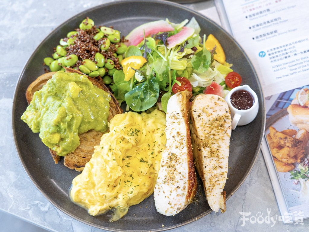 ▼早午餐拼盤的舒肥雞胸,以低溫烹調手法做出鮮嫩而不柴的紮實肉感,搭配蜜香酪梨抹醬與滑嫩鮮香的炒蛋,吃完有滿滿的飽足感、又輕盈無負擔。