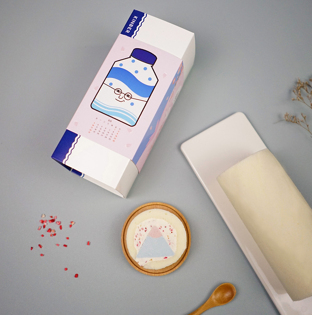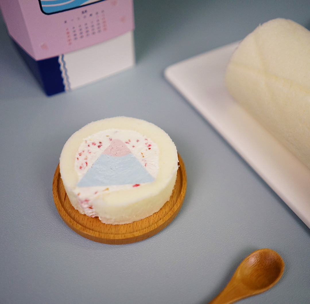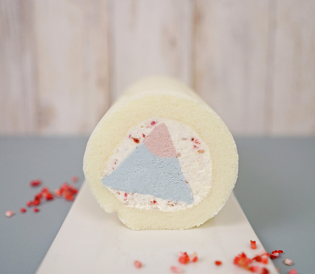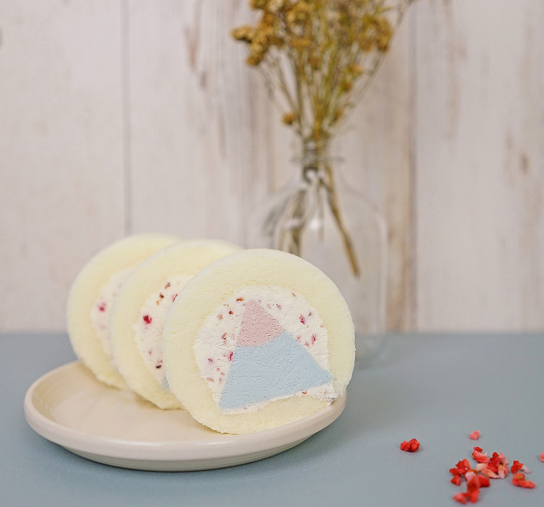 ▼這款超夢幻的「可爾卑思山型捲」的山型底部(淺藍)為可爾必思風味內餡,而山頂以粉色系莓果呈現外圍生乳餡點綴草莓碎果乾,宛如櫻花飄落景色優美超有意境!