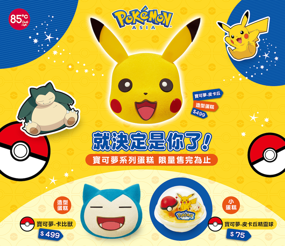 2020年06月10日寶可夢的粉絲們,就決定是你了!繼Mister Donut推出可愛到不行的寶可夢甜甜圈後,85℃竟然也將於6/11起推出台灣限定的寶可夢造型蛋糕,神還原皮卡丘、卡比獸的大頭造型,可愛的造型蛋糕粉絲們慶生、過節必吃!