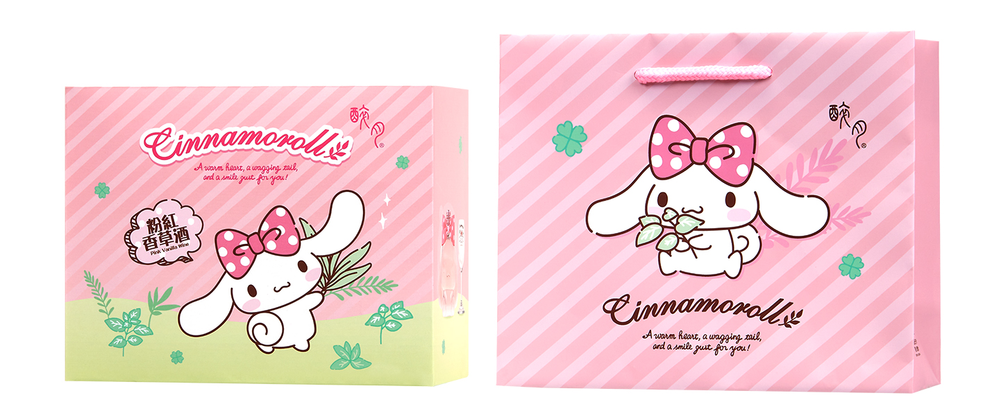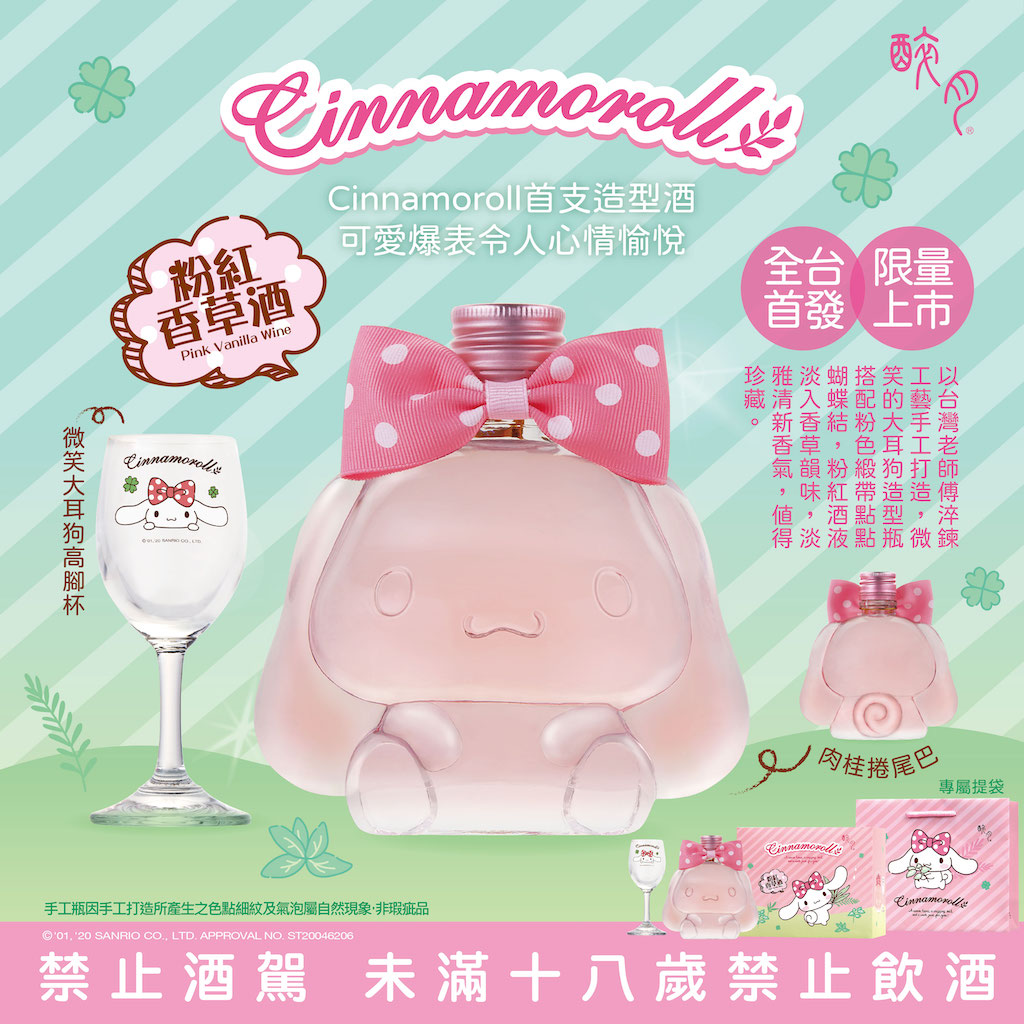 ▼台灣自有品牌「醉月」這次與可愛的「Cinnamoroll大耳狗」聯手推出這款可愛到不行的「粉紅香草酒」,以台灣老師傅淬鍊工藝手工製作,微笑的大耳狗造型瓶搭配粉色緞帶點點蝴蝶結及專屬酒杯,像肉桂捲一樣的超Q尾巴,可愛度超吸睛。