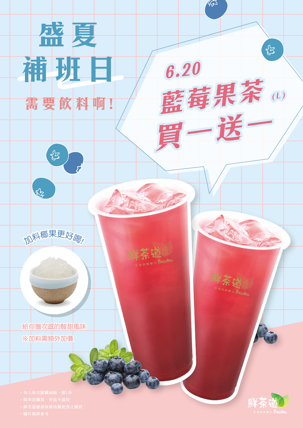 ▼6.手搖品牌「鮮茶道」則在6/20當天推出人氣商品「藍莓果茶」買一贈一活動,富含多種莓果的酸V滋味喝起來清爽消暑,趕跑補班日的煩悶不耐!