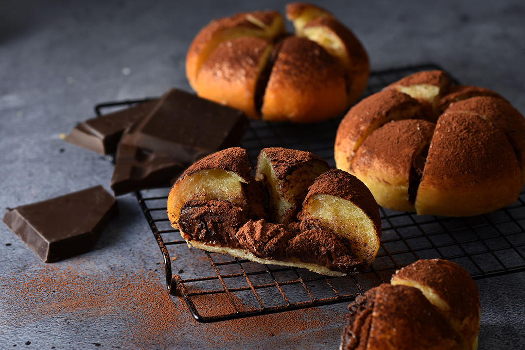 ▼「巧克力卡士達$65 元 」使用含有榛果顆粒的義大利頂級榛果巧克力,融入以鮮奶油加入台灣在地鮮奶製作的卡士達醬,將巧克力卡達擠進麵包後,表層再灑上比利時可可粉與杏仁角增加烘焙香氣,吃起來髒髒又美味!