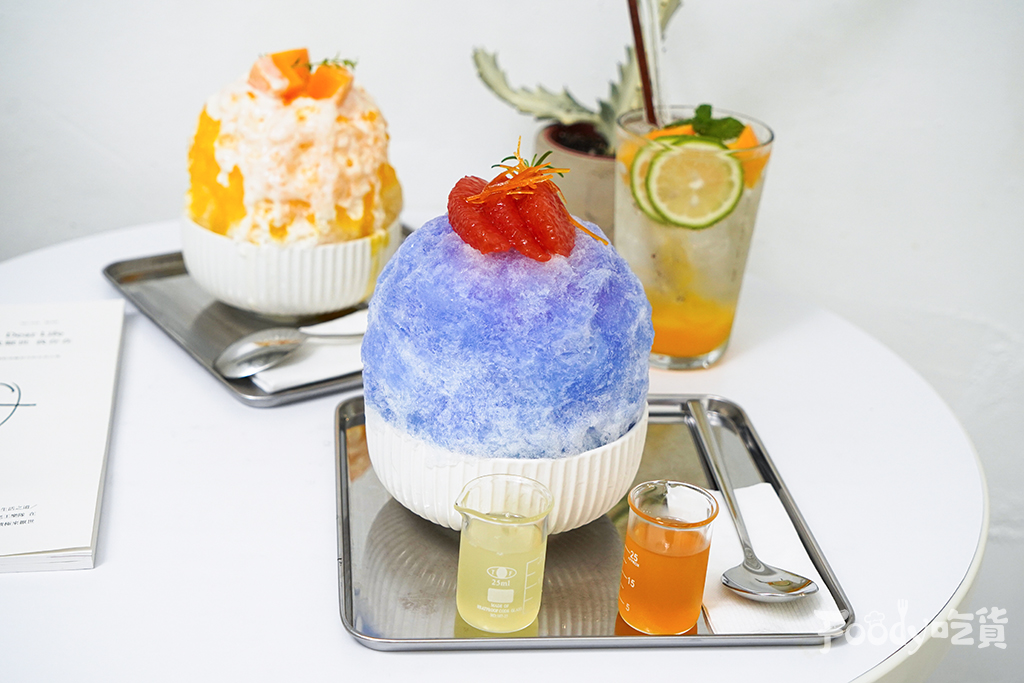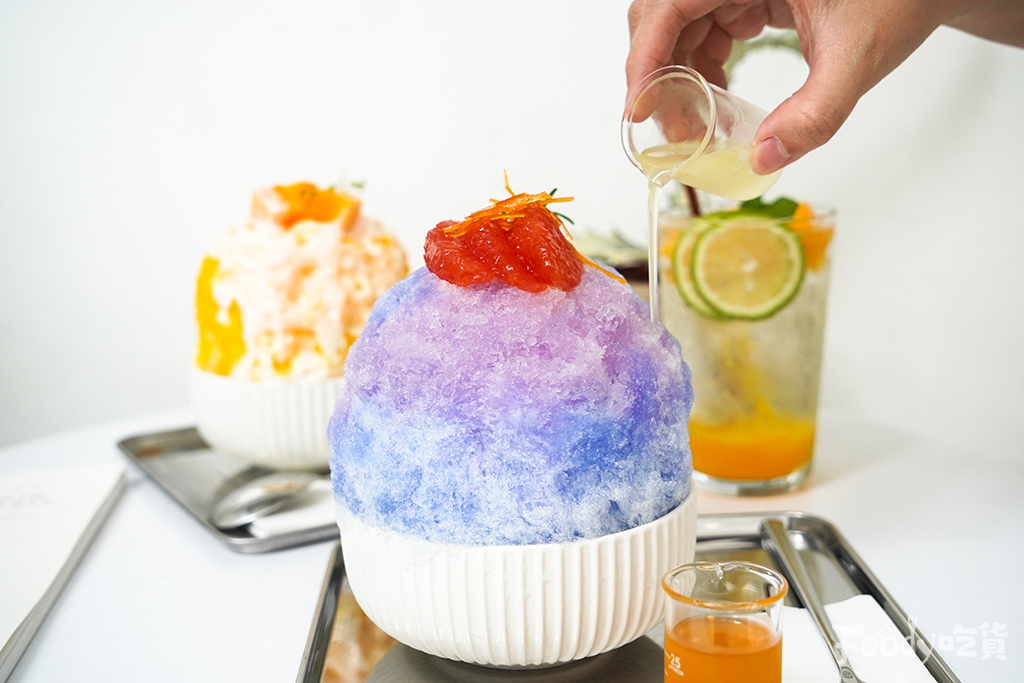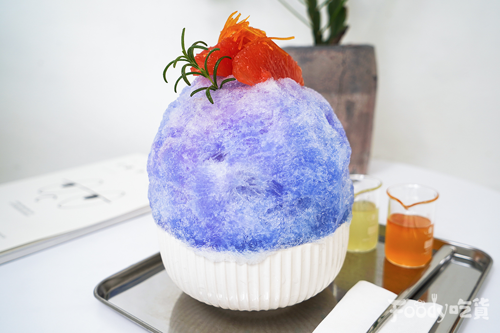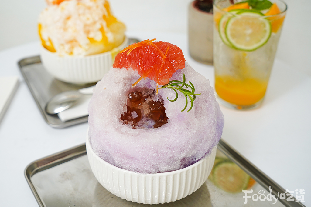 ▼冰品的部分首先就要來介紹這款「葡萄柚蝶豆花$160」,嚴選布魯農場自然農法的蝶豆花熬成糖漿搭配新鮮的葡萄柚,酸酸甜甜的口感讓人吃一口就愛上,隨冰還附上了「伯爵茶茶凍&白酒糖漬葡萄柚」和「薄荷檸檬糖水&白酒葡萄柚糖水」,特別的是在淋醬的同時,原本是藍色的冰品瞬間變成了漸層的絕美紫色,這絕對是藝術品等級的冰品啊~