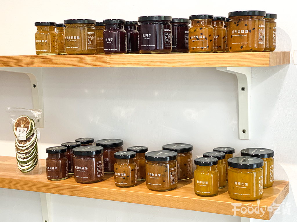 ▼架上還放滿了一整排的自製果醬,舉凡百香果鳳梨、薄荷蘋果和鮮檸芒果果醬通通有,喜歡果醬的朋友們可以選購一波!