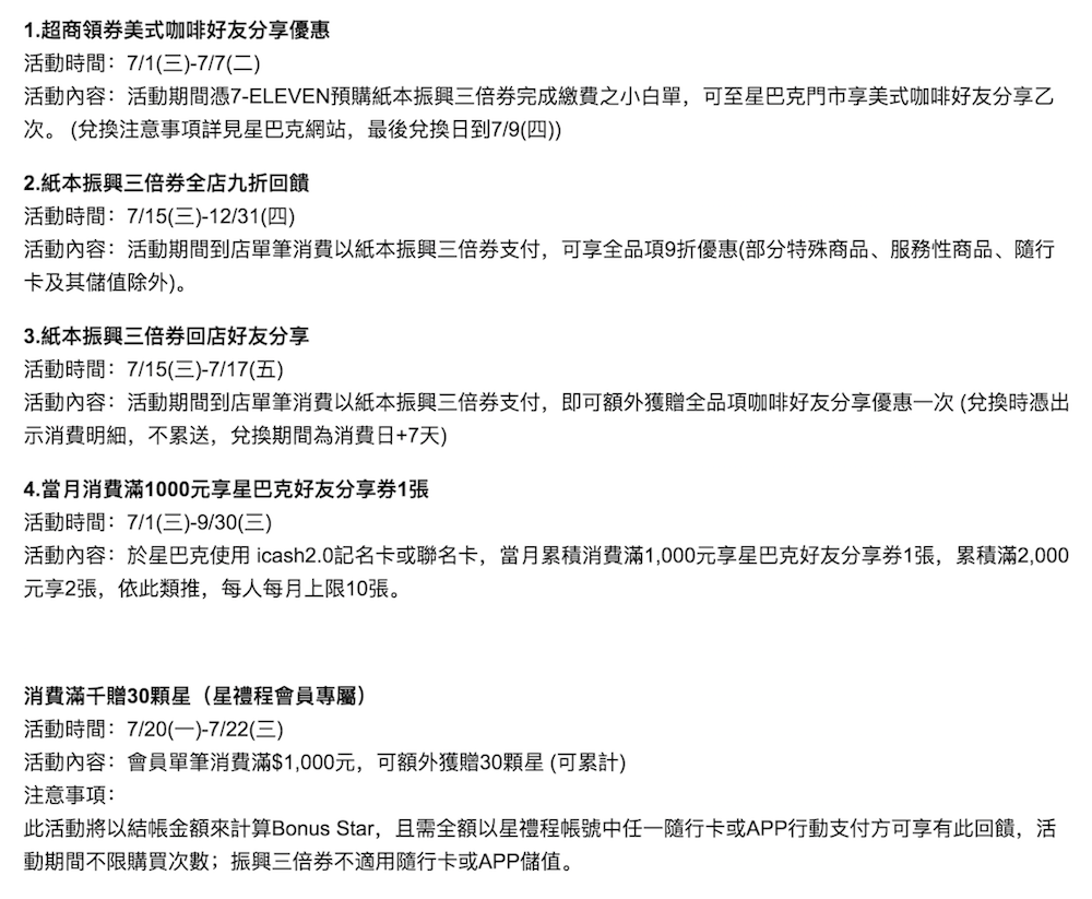 ▼首三日7月15日至7月17日,更加碼以紙本振興三倍券到店單筆消費,即可額外獲贈全品項咖啡「買一送一」好友分享優惠券一張(兌換時憑出示消費明細,不累送,兌換期間為消費日+7天)。而7/1-9/30期間,當月只要以icash2.0記名卡或聯名卡累積消費1000元,即再加贈一張好友分享券(每人每月上限10張);7/20-7/22,星禮程會員單筆消費滿千再贈30顆星,各種優惠享不完啦!