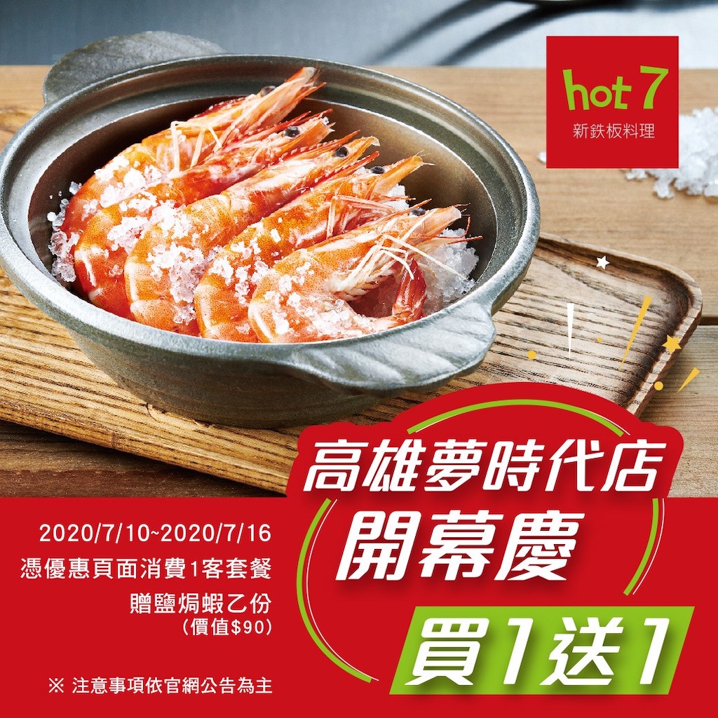 ▼這次「hot7」進駐位於南高雄的統一夢時代購物中心,結合視聽娛樂的夢時代購物中心,讓大人小孩一天玩不完、美食吃不完~預定7月10號熱情開幕,開幕首七日,只要來店消費任1客『原塊新鉄板料理套餐』,即招待「鹽焗蝦」1份(價值90元),hot 7高雄夢時代店限定!歡迎高雄的朋友們一起來hot 7高雄夢時代店,品嘗滋滋作響的美味鉄板料理吧!