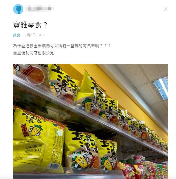 2020年07月08日每次逛街時經過寶雅,都會忍不住走進去晃一下,不管是美妝保養品還是居家日常用品,這裡的商品應有盡有。近日有網友在Dcard上分享一張寶雅零食區的照片,只見整排層架通通都是「玉米濃湯餅乾」,讓他好奇發問「為什麼這款玉米濃湯,可以稱霸一整排零食架?」,沒想到釣出寶雅員工出來解釋!