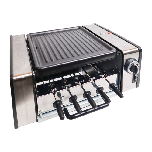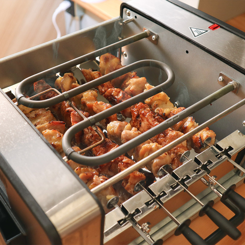 ▼燒烤機由上下兩部分組成:上方是專門用來烤肉片、海鮮等的烤盤,下方則是附有「自動旋轉」功能的串燒專用烤台!一次最多可以同時烤五支串燒。