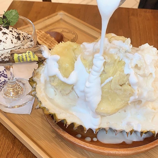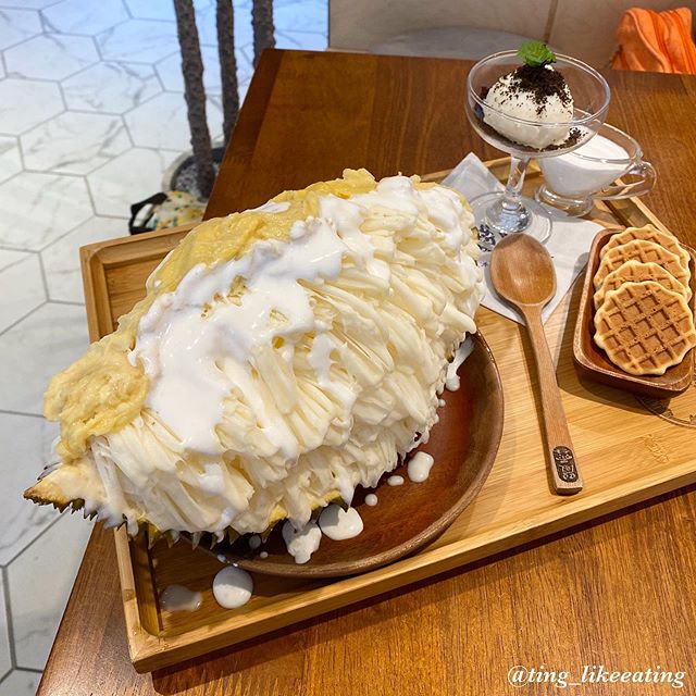 ▼榴槤雪花冰頂層淋了鹹奶油,讓整體味道更添層次。旁邊還有奶霜、餅乾可以做搭配,另外附的一球冰淇淋也是榴槤口味喔!