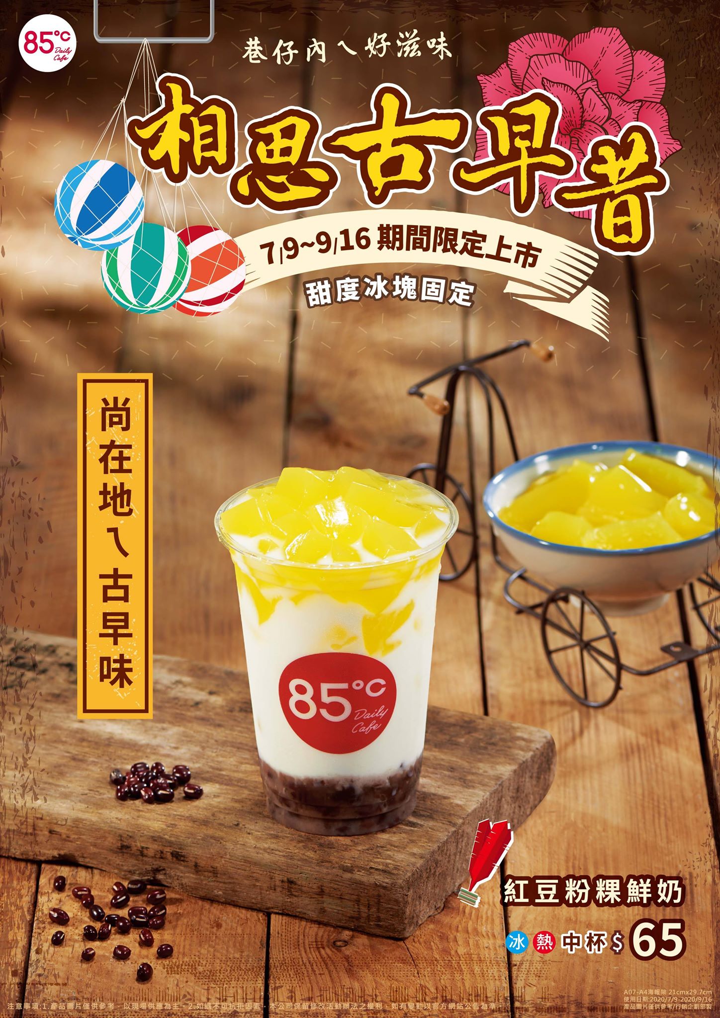 2020年07月13日還記得小時候最愛吃的紅豆粉粿刨冰嗎?現在用喝的也可以!85˚C最近推出懷舊飲品「紅豆粉粿鮮奶」,綿密的紅豆和手工製作的Q彈粉粿與鮮奶交融,豐富的咀嚼口感,每一口都是巷仔內尚在地ㄟ古早味,7/9號起全台ㄉㄨㄞ ㄉㄨㄞ上市啦!