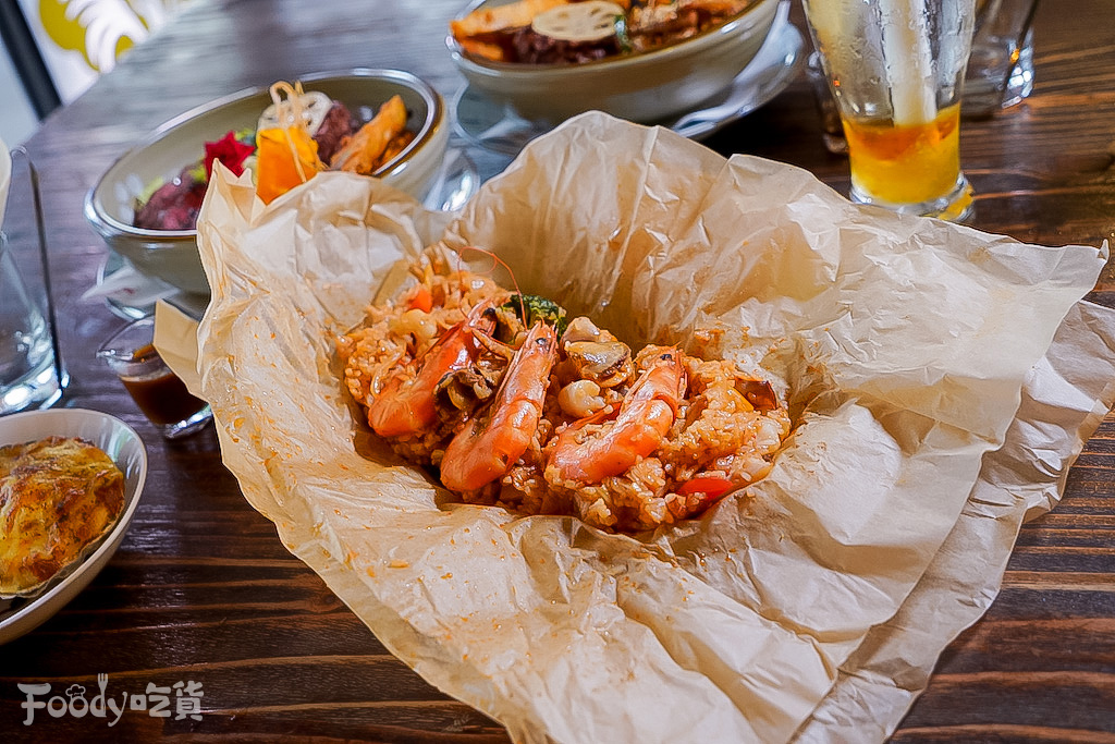 ▼招牌「火烤飯」(深海火怪,420元),將炒過的飯包入烤紙,再放入烤箱烘烤,類似燉飯般的烹調手法,能將食材精華鎖在紙中,一拆開來香氣隨之奔放而出,飯吸飽了海鮮滿滿的鮮甜味,整體口感更加濕潤綿密,來店必吃!