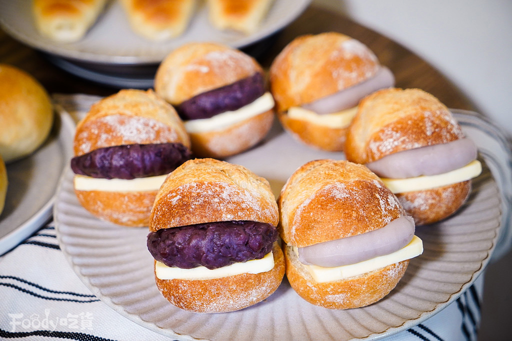 ▼還有人氣的「奶油法國」系列,分為紅豆餡(50元)跟芋泥餡(55元):香濃紅豆餡能嚐到顆粒,搭配法國鹹奶油、紮實耐嚼的軟法麵包,多層次美味甜而不膩;而綿密的芋泥餡則最適合芋頭控開吃,滿滿內餡中還藏有蜜芋頭塊,搭配鹹蛋黃以及奶油香氣,轉眼間就嗑掉一整個!