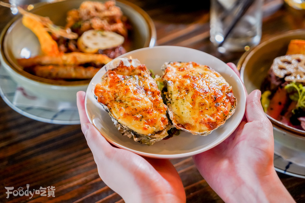 ▼另一款活動限定的「勤美限定奶焗生蠔」(150元/一對,可憑七月半圈圈50元折抵券免費兌換,加價99元再多一對),生蠔底下鋪滿洋蔥,上層灑滿馬佐拉起司,烤箱中高溫直火考炙,充分把洋蔥甜味、生蠔的濃郁海味包在鹹香牽絲的起司中,生蠔也是大得不像話,份量超滿足!