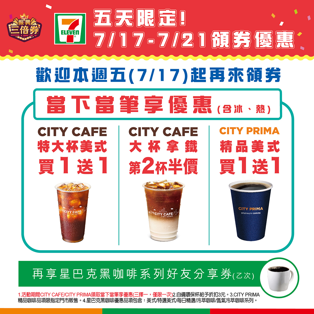 ▼對此,7-ELEVEN也於7月17日起至7月21日止推出「晚鳥優惠」,活動期間取券當下當筆即可享咖啡優惠三擇一:「CITY CAFE大杯拿鐵第二件半價」、「CITY CAFE特大美式買一送一」或「CITY PRIMA精品美式買一送一」。此外,加碼送星巴克黑咖啡系列好友分享券,活動期間持券到星巴克門市購買兩杯相同容量、風味、冰熱的指定黑咖啡系列飲料,其中一杯由星巴克招待,兌換時間為7月17日起至7月23日止。