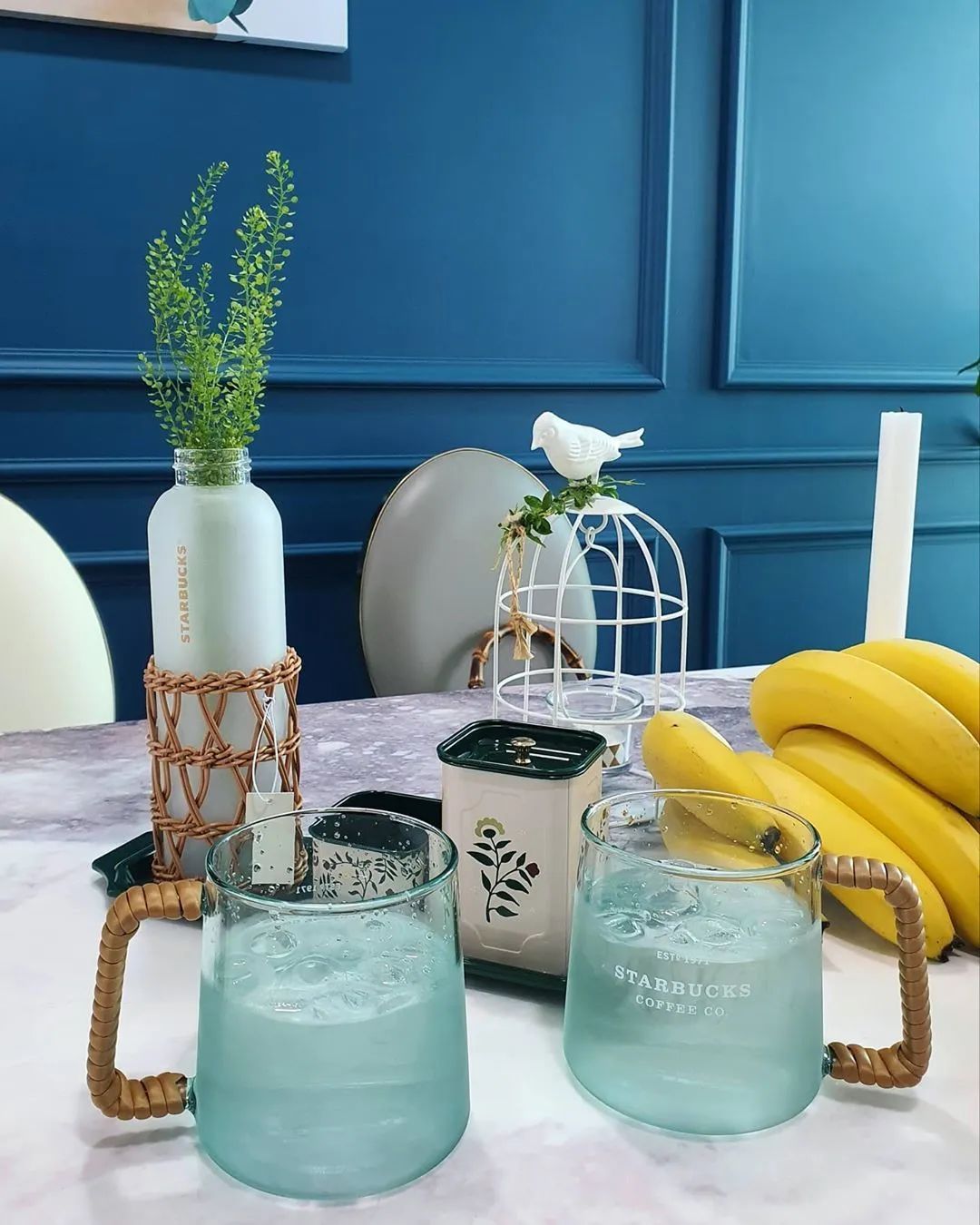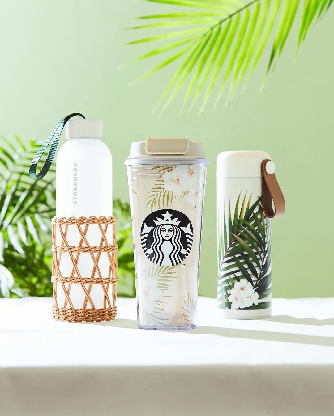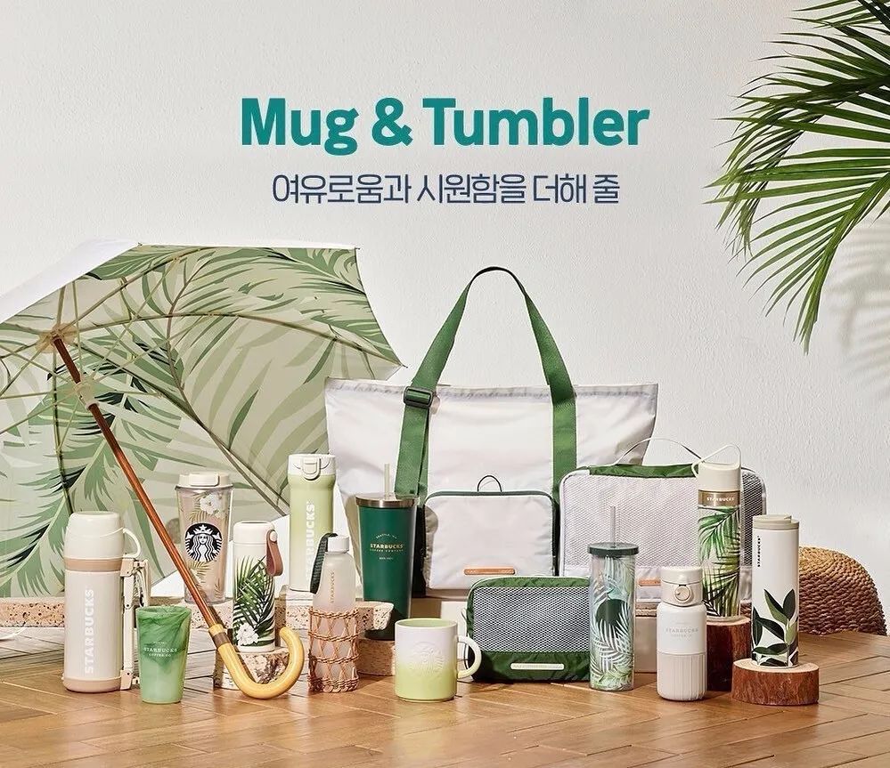 ▼這款玻璃杯其實是南韓星巴克「叢林系列」商品中的其中之一,整個系列以米色為基調,綴以墨綠色葉片,延伸出全套肩背包、陽傘、隨行杯、馬克杯等商品,大面積樹葉讓人視覺上就先消暑了一大半。
