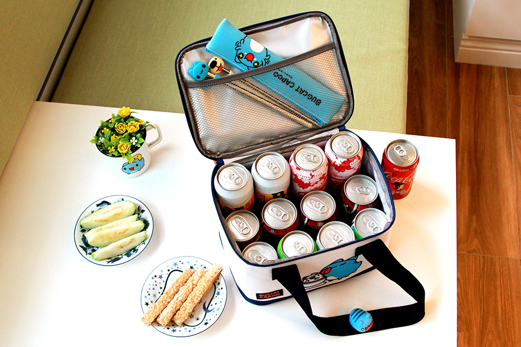 ▼保溫保冷袋的前後皆印有咖波圖案,可置放12瓶500ml鋁罐飲料,內層為鋁膜層,可有效保溫又易清潔,並設有置物網袋可放毛巾、餐具、吸管等小物!