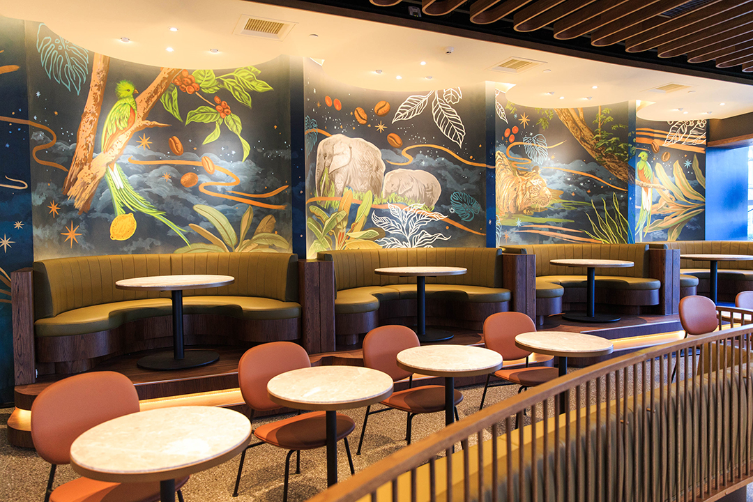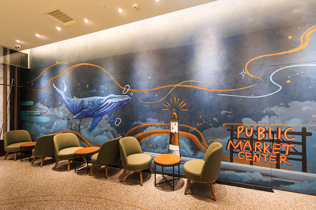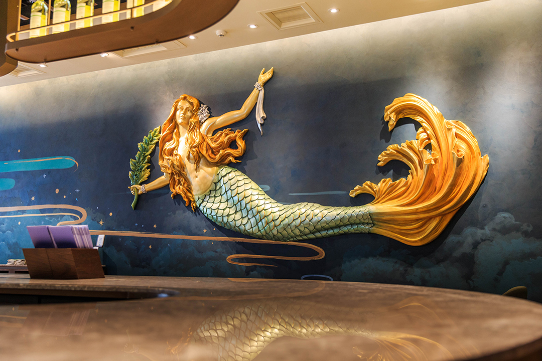 ▼全門市更以三大ARTWORK藝術牆面,描繪出海洋與女神的傳說,一進門A區,映入眼簾的是玻璃纖維製作而成的星巴克女神;吧檯旁的B區,則描繪出從西雅圖派克市場出發,駛向高雄夢時代門市位於夢時代購物中心的藍鯨館;最裡面的C區,則是以星空為背景的咖啡原產地三大產區,整間店的設計都充滿了巧思!