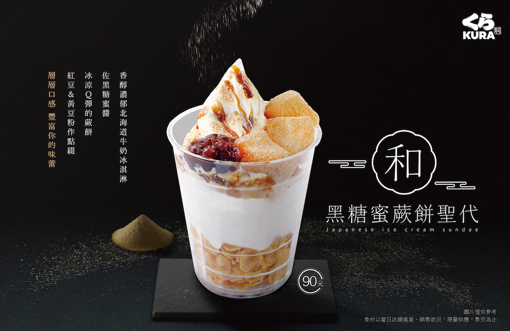 ▼絕不容錯過的人氣甜點「黑糖蜜蕨餅聖代」(90元),香醇濃郁北海道牛奶冰淇淋,加上冰涼Q彈的蕨餅、再以甜而不膩的紅豆及黃豆粉點綴,多層次的豐富口感在嘴裡慢慢化開,在今年夏天為所有消費者帶來沁涼甜蜜的好滋味!