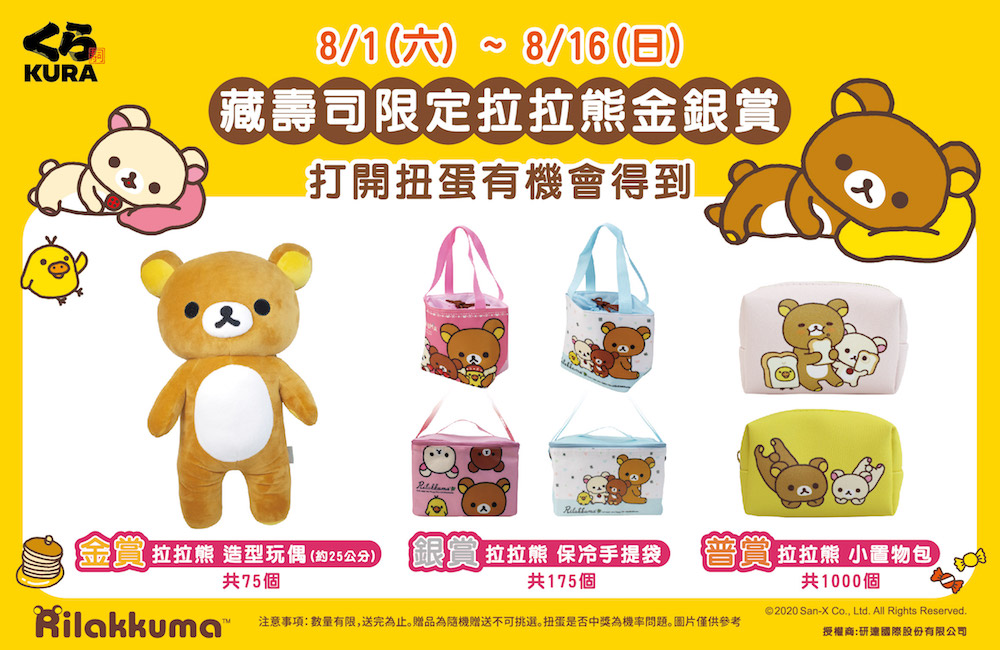 ▼為歡慶新店面開幕,全台藏壽司也將於8/1-8/16期間推出「藏壽司限定拉拉熊金銀賞」,無論是實用的小置物包(普賞)、保冷手提袋(銀賞),或是最大金賞、超可愛又療癒的拉拉熊造型玩偶,只要到全台藏壽司用餐,都有機會帶回家!