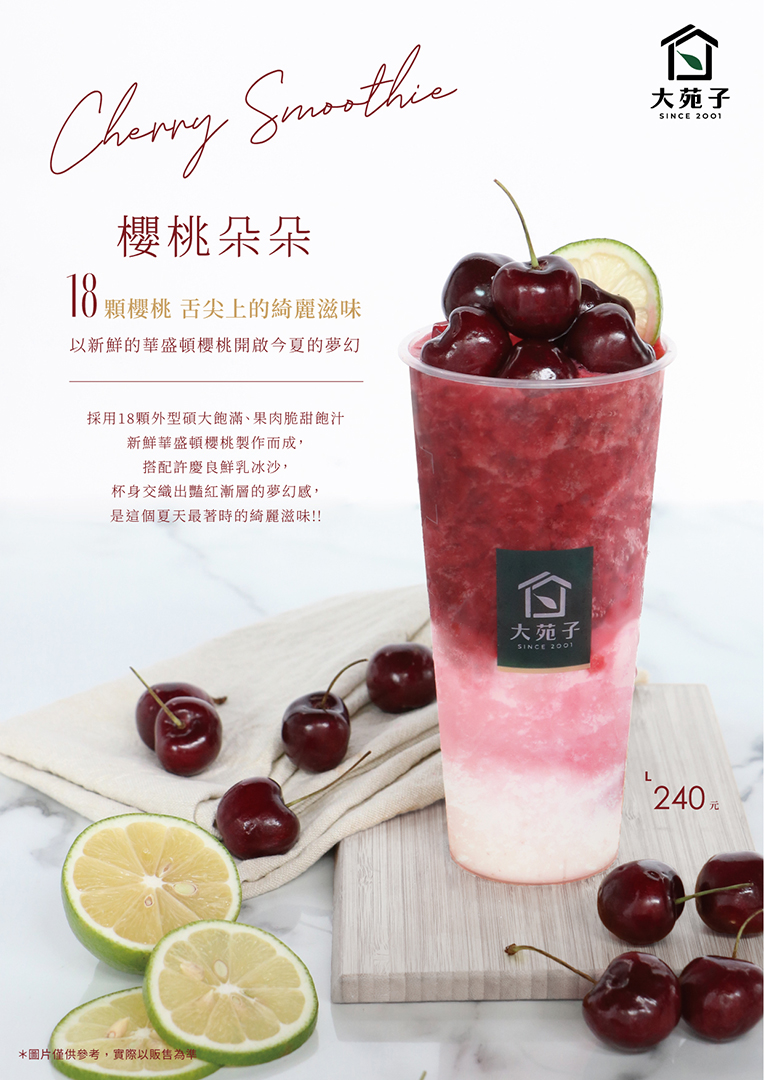 2020年07月28日櫻桃控在哪裡?今天夏天大苑子首度推出由18顆櫻桃製作而成的「櫻桃朵朵」,嚴選最新鮮的華盛頓櫻桃製作,搭配鮮乳製成的鮮乳冰沙,酸酸甜甜的好滋味絕對是炎炎夏日了必嚐的消暑聖品!