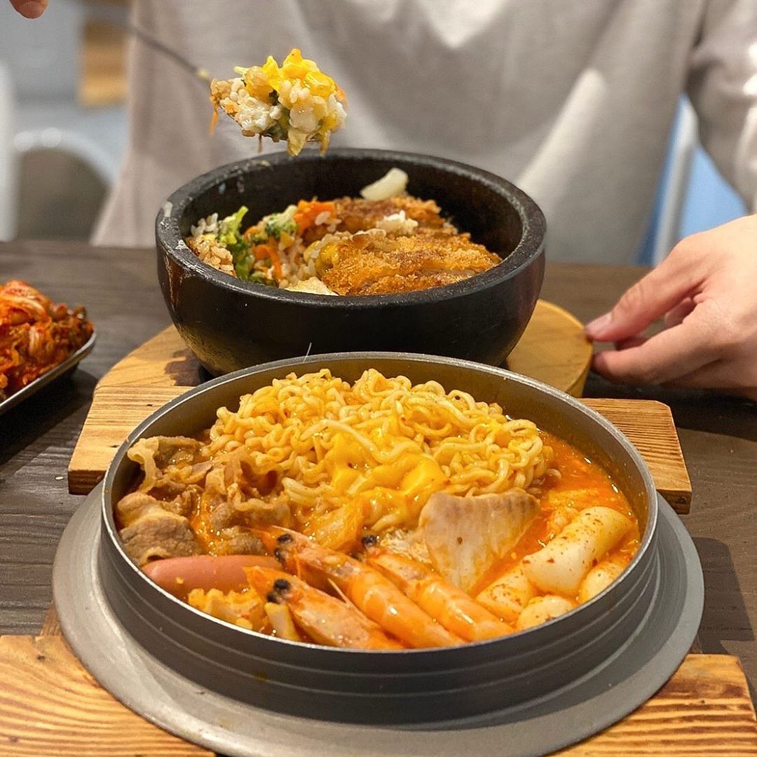 ▼餐點則是韓式料理常見的石鍋拌飯、部隊鍋等等,其中韓式泡菜牛肉鍋(NT$ 198)大食控必點,滿滿的配料搭配韓國QQ泡麵,微辣泡菜湯底吃起來暖胃又涮嘴,也可以加點起司(NT$ 20)、年糕(NT$ 50)、肉片(NT$ 50)等等,口味道地又能吃得滿足~