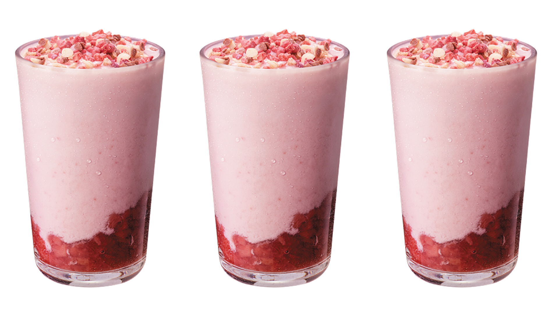 ▼「草莓脆片優格星冰樂」(售價 中杯140元/大杯160元/特大杯180元)沒有草莓味的夏天是不完美的!濃郁的優格與草莓果醬混合在一起,創造出優格微酸與水果甜味巧妙的風味組合。加入草莓吉利和草莓丁,將口感與視覺體驗提升到另一個層次。草莓乾碎粒和Granola穀麥片撒在頂部,更增添飲料口感與層次。