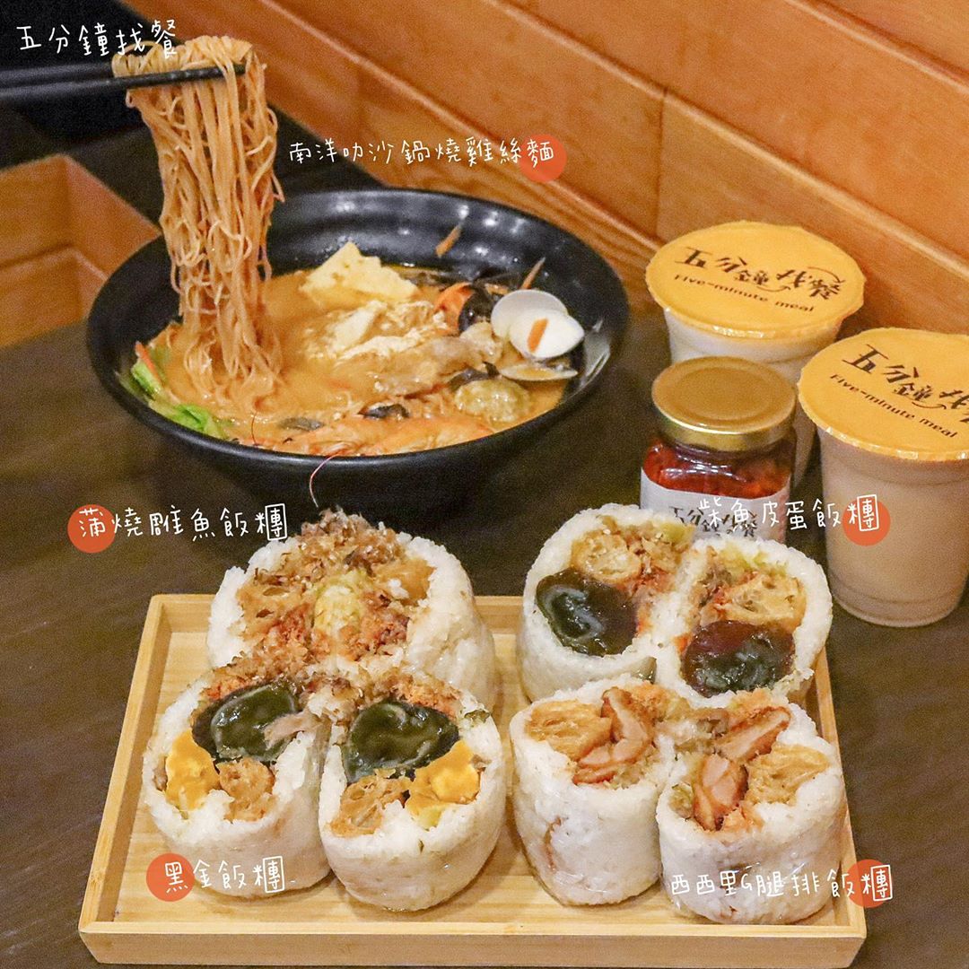2020年08月05日高雄三民區人氣超夯的早餐「五分鐘找餐」,店內販售各式各樣不同口味的飯糰,有皮蛋搭配柴魚的「黑金飯糰」,也有鹹甜美味的蒲燒鯛魚飯糰,想要更有飽足感的話,還可以點南洋風味的叻沙鍋燒雞絲麵,早餐品項多到你選不出來要吃什麼~