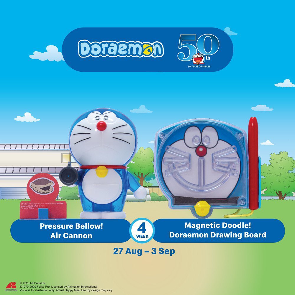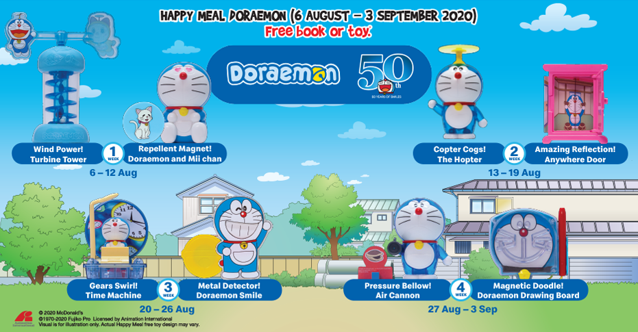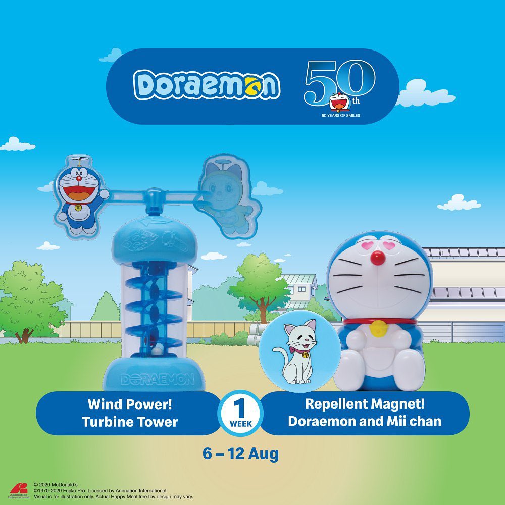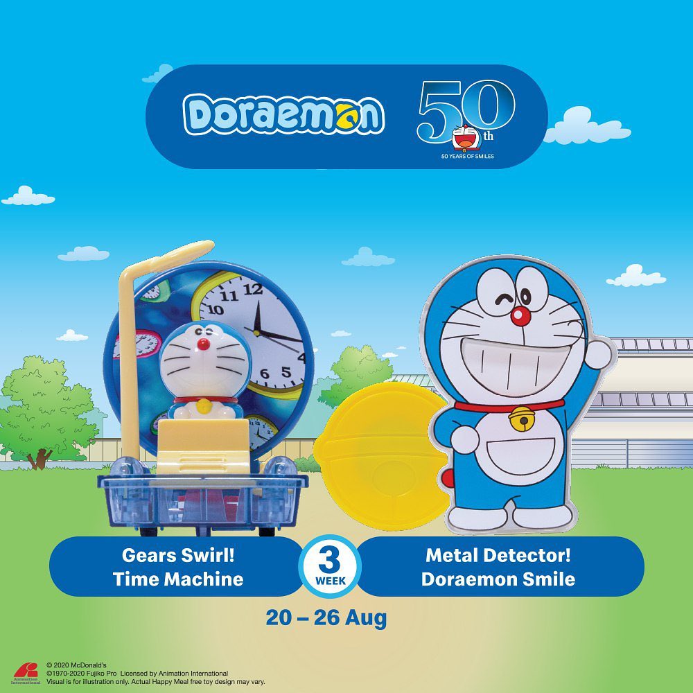2020年08月08日為配合哆啦A夢50週年,新加坡麥當勞特別推出了一系列紀念玩具。8月6日到9月3日,只要去麥當勞吃快樂兒童餐,就能拿到可愛的玩具啦。而且這些玩具是分段換領的,想集齊一整套要多去幾次才行~
