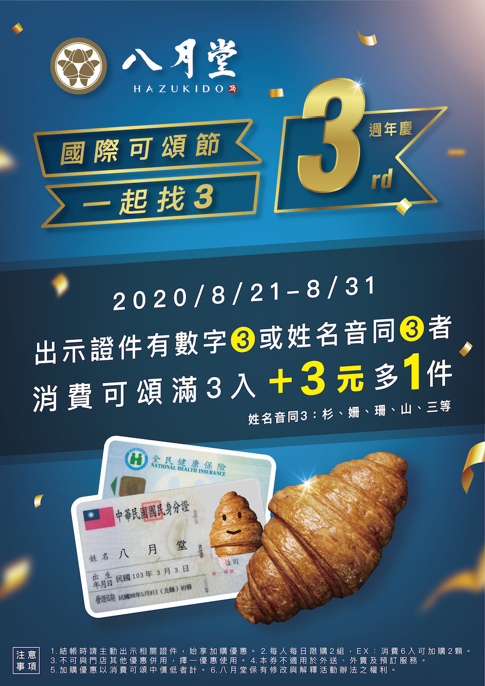 ▼此外,八月堂也將回饋老顧客,於8/21-8/31期間於全台櫃位(含快閃店),出示證件中含有數字3或是名字諧音3的人(珊/杉/三…),消費滿3顆可頌,即可享3元加購多一件優惠(價低者計),每人每日限加購2顆。