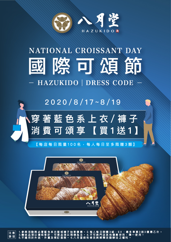 ▼去年八月堂首度推出817國際可頌節,今年加碼8/17-8/19三天,加入「Dress Code」元素,只要身穿代表八月堂品牌主色調的「藍色」上衣或褲子、裙子,至全台正櫃即可享買一贈一優惠(每人最多限贈三顆,美店限量100名)。