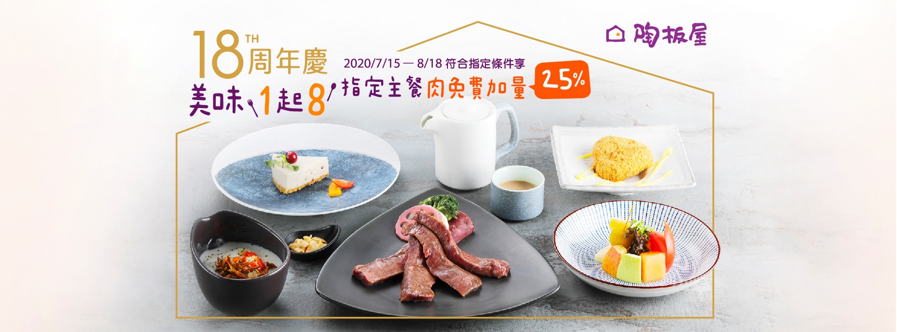 ▼王品集團旗下以當令食材與日式手法詮釋料理美味的「陶板屋」,今年邁入第18個年頭,為歡慶18歲生日全台33家門店邀請大家一起再回到陶板屋感受家的溫度,即日起至8月18日,只要身分證字號中有陶板屋英文「T、O、K、I、Y、A」或「1、8」的任一英文字母或數字,立即享指定主餐:香蒜瓦片牛肉,免費肉量加量25%!